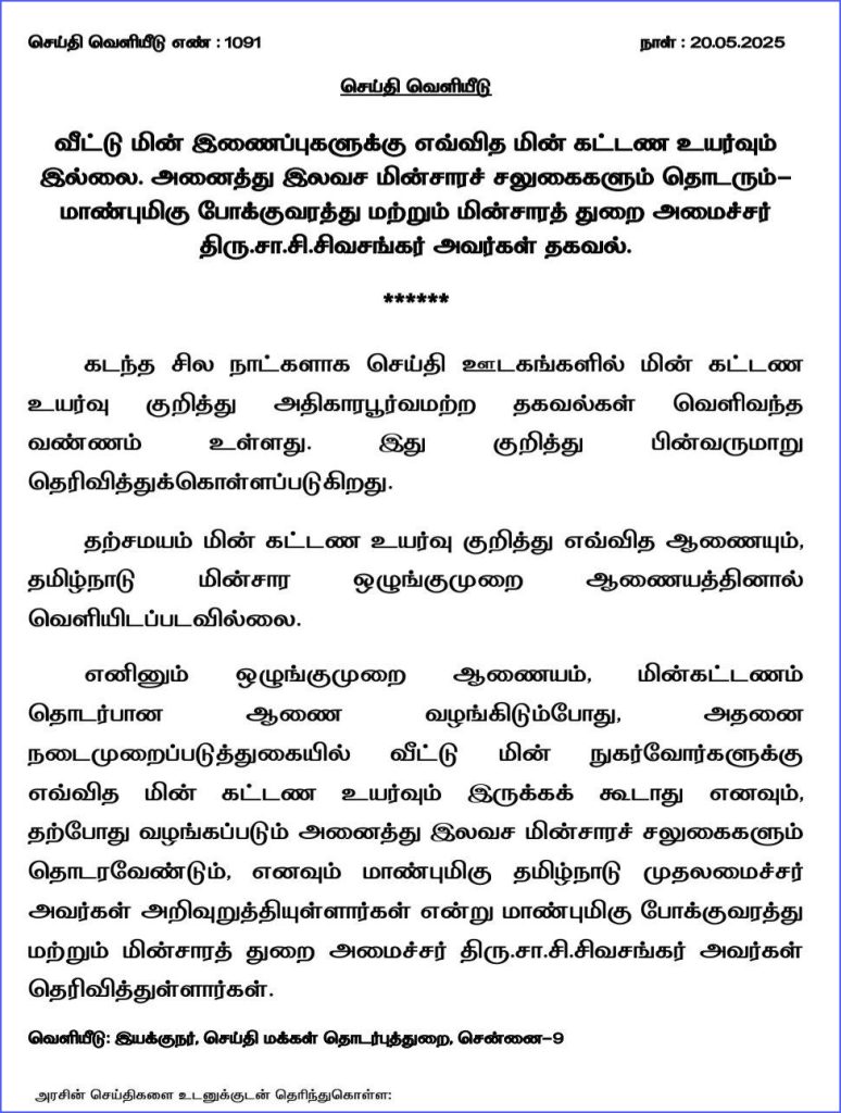 இந்த நிலையில், வீட்டு மின் இணைப்புகளுக்கு எவ்வித மின் கட்டண உயர்வும் தற்போது இல்லை. அனைத்து இலவச மின்சாரச் சலுகைகளும் தொடரும் என தமிழ்நாடு அரசு விளக்கம் அளித்துள்ளது.