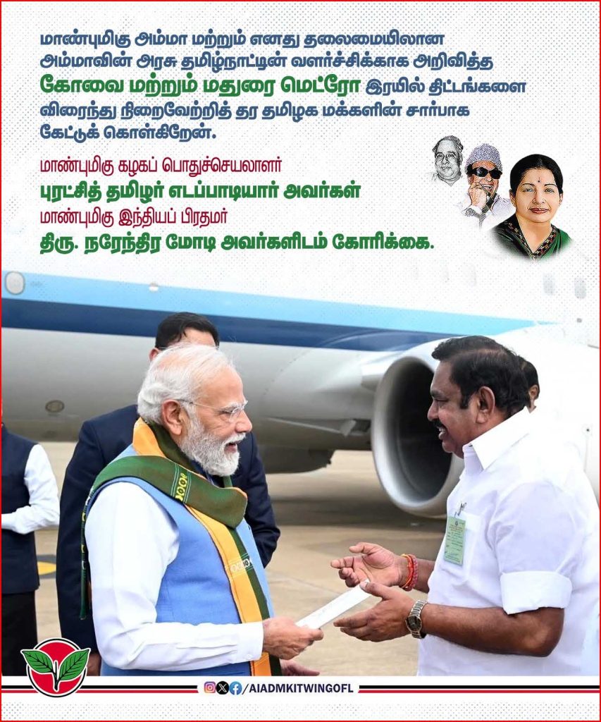 கூடுதலாக, மறைந்த முதல்-அமைச்சர் அம்மா அறிவித்து, இந்த பிராந்தியத்தின் வளர்ச்சிக்காக நான் மீண்டும் வலியுறுத்திய கோவை மற்றும் மதுரை மெட்ரோ ரயில் திட்டங்களை விரைவாக செயல்படுத்துமாறு தமிழக மக்கள் சார்பாக நான் வேண்டுகோள் விடுக்கின்றேன்.