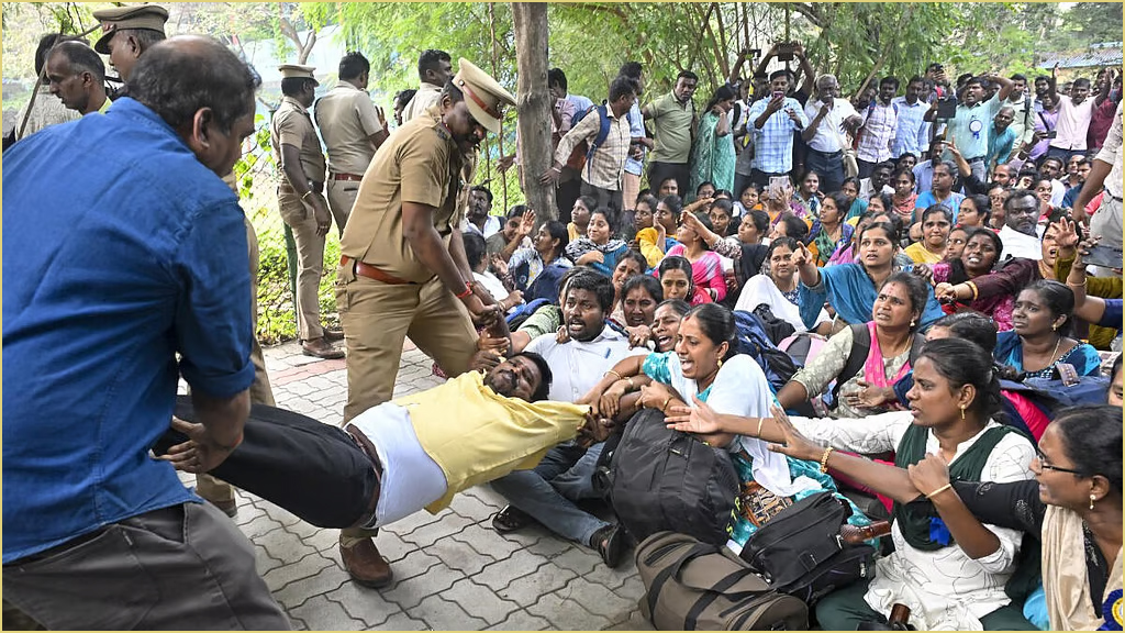 மேலும், “15 ஆண்டுகளாக சம வேலைக்கு சம ஊதியம் கோருகிறோம். நியாயம் கேட்டுப் போராடினால் வழக்குப் பதிவு செய்கிறீர்களே. முந்தைய ஆட்சியில் எங்களை காவல் துறை மோசமாக நடத்தியபோது கண்டித்தீர்கள். நீங்கள் எதிர்க்கட்சித் தலைவராக இருந்தபோது எங்கள் கண்ணீரைத் துடைப்பேன் என்றீர்களே. அந்த கண்ணீர் துடைக்கும் கரங்களுக்காக காத்திருக்கிறோம்” என்று முதல்வர் ஸ்டாலினைக் குறிப்பிட்டு, போராட்டக் களத்தில் இருந்து குரல்கள் எழுகின்றன.