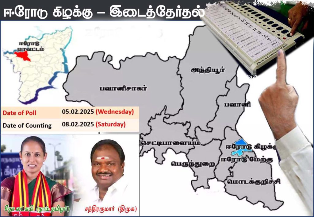ஈரோடு கிழக்கு தொகுதி சட்டமன்ற உறுப்பினராக இருந்த ஈ.வி.கே.எஸ். இளங்கோவன் 2024ம் ஆண்டு டிசம்பரில் உயிரிழந்ததை அடுத்து அந்த தொகுதிக்கு இடைத்தேர்தல் அறிவிக்கப்பட்டு உள்ளது. அதன்படி, ஈரோடு கிழக்கு தொகுதிக்கு நாளை மறுநாள் ( பிப்ரவரி 5-ம் தேதி) வாக்குப்பதிவு நடைபெற இருக்கிறது. வாக்குகள் எண்ணிக்கை பிப்ரவரி 8ந்தேதி நடைபெறும் என தேர்தல் ஆணையம் அறிவித்து உள்ளது.