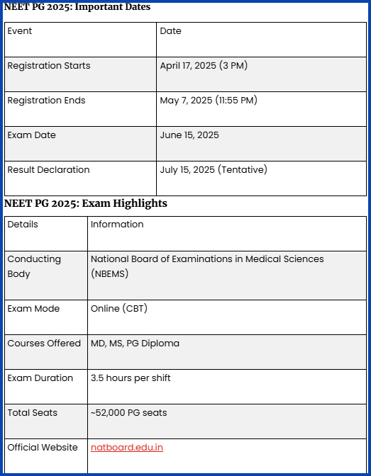 எம்எஸ்/ எம்டி/ பிஜி டிப்ளமோ ஆகிய முதுநிலை மருத்துவப் படிப்புகளில் சேருவதற்கு முதுநிலை நீட் தேர்வு கட்டாயமாகும். தேசிய மருத்துவக் கல்வி தேர்வு வாரியம் (NBEMS) மூலம் இத்தேர்வு ஆண்டு ஒரு முறை நடத்தப்படுகிறது. இளநிலை மருத்துவப் படிப்பை முடித்தவர்கள் முதுநிலை மருத்துவம் படிக்க தகுதியானவர்கள். இந்நிலையில், 2025-ம் ஆண்டுக்கான முதுநிலை நீட் தேர்விற்கு (NEET PG 2025) அறிவிப்பு வெளியாகியுள்ளது. அதன்படி, இன்று (ஏப்ரல் 17) மதியம் 3 மணி முதல் ஆன்லைன் வழியாக விண்ணப்பிக்கலாம் என தெரிவிக்கப்பட்டுள்ளது.