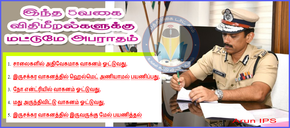 ஆகிய 5 வகையான விதிமீறலுக்கு மட்டுமே அபராதம் விதிக்க வேண்டும் என சென்னை மாநகர காவல் ஆணையர் அருண் உத்தரவிட்டுள்ளார்.