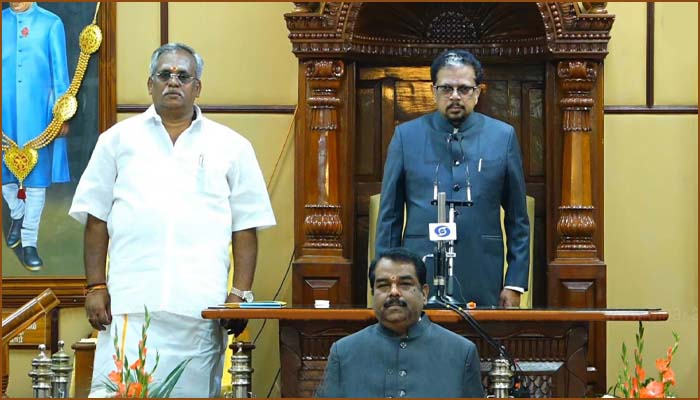 ஆண்டின் முதல் கூட்டத்தொடர் என்பதால் ஆளுநர் உரையுடன் தொடங்கியுள்ள நிலையில், பேரவைக்கு வருகை தந்த துணை நிலை ஆளுநர் கைலாஷ்நாதனுக்கு அணிவகுப்பு மரியாதை அளிக்கப்பட்டு முதல்வர் ரங்கசாமி வரவேற்றார். இதைத்தொடர்ந்து, அவையில் ஆளுநர் உரையாற்றினார்.