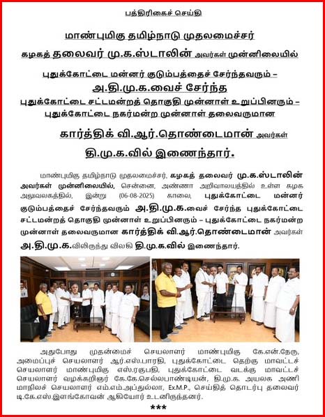 இது குறித்து திமுக தலைமைக் கழகம் வெளியிட்ட அறிக்கையில், முதல்வரும் திமுக தலைவருமான மு.க. ஸ்டாலின் முன்னிலையில், சென்னை, அண்ணா அறிவாலயத்தில் உள்ள திமுக அலுவலகத்தில், இன்று (ஆக. 6) காலை, புதுக்கோட்டை மன்னர் குடும்பத்தைச் சேர்ந்தவரும் புதுக்கோட்டை முன்னாள் எம்.எல்.ஏ. மற்றும் நகர்மன்ற முன்னாள் தலைவருமான கார்த்திக் வி.ஆர்.தொண்டைமான் அதிமுகவிலிருந்து விலகி திமுகவில் இணைந்தார் என்று தெரிவிக்கப்பட்டுள்ளது.