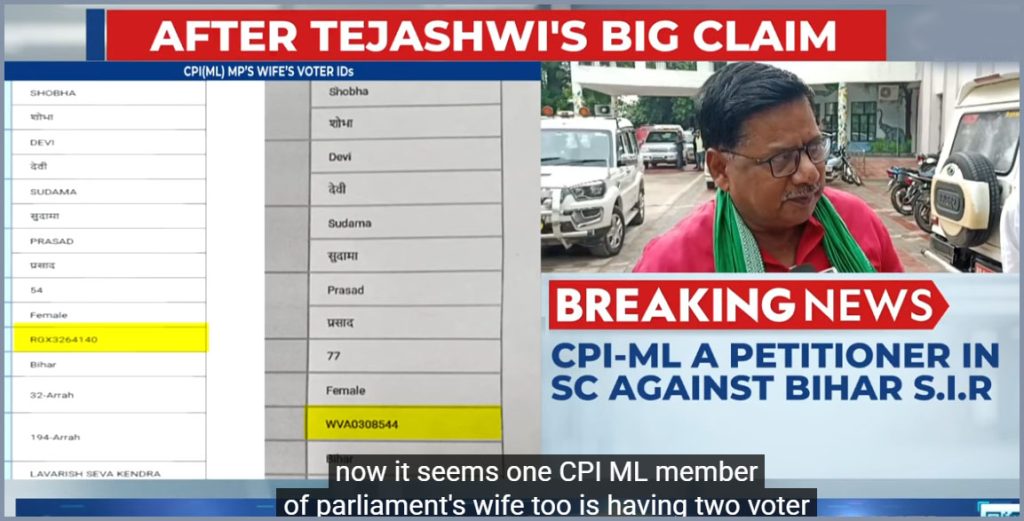 இந்த பரபரப்புக்கு மத்தியில் ஆர்ஜேடி தலைவர் தேஜஸ்வி யாதவ் இரு வாக்காளர் அடையாள அட்டை வைத்திருந்தது சலசலப்பை ஏற்படுத்தி உள்ளது. இவர் மட்டுமின்றி, சிபிஎம் எம்எல் எம்.பியின் மனைவியும் இரு வாக்காளர் அடையாள வைத்திருப்பது தெரிய வந்துள்ளது. இதன் காரணமாக, தேர்தல் ஆணையத்துக்கு எதிராக பொங்கி எழுந்த இண்டியா பிளாக்கின் குற்றச்சாட்டுக்கள் கேள்விக்குறியாகி உள்ளது.