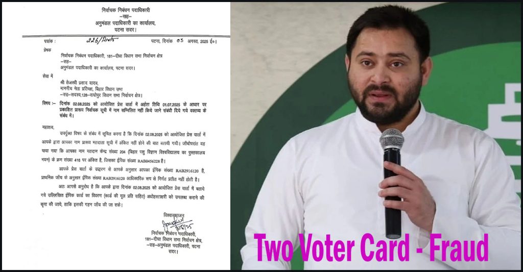 இந்திய தேர்தல் ஆணையம் ஆகஸ்டு 1ந்தேதி பீகார் மாநில வரைவு வாக்காளர் பட்டியலை வெளியிட்டது. இந்த பட்டியலில் தனது பெயர்  இடம்பெறவில்லை என செய்தியாளர்களிடம்  பேசிய தேஜஸ்வி யாதவ்,  இந்திய தேர்தல் ஆணையம் மீது கடுமையாக விமர்சனங்களை அள்ளி வீசினார். இதைடுத்து, , தேர்தல் ஆணையம், அவரது பொய் குற்றச்சாட்டை அம்பலப்படுத்தி உள்ளது.  அவர் இரு வேறு இடங்களில் பொய்யான அட்ரஸ் கொடுத்து வாக்காளர் அடையாள அட்டை வைத்திருந்தார் என்பதை  சுட்டிக்காட்டியதுடன், அதில் ஒன்றுதான் தற்போது நீக்கப்பட்டு உள்ளதாக  தெரிவித்துள்ளதுடன், போலியான வாக்காளர் அட்டை வைத்திருந்தது  கிரிமினல் குற்றம் என்று தெரிவித்துள்ள தேர்தல் ஆணையம், அதுகுறித்து விளக்கம் அளிக்க தேஜஸ்விக்கு நோட்டீஸ் அனுப்பி உள்ளது.