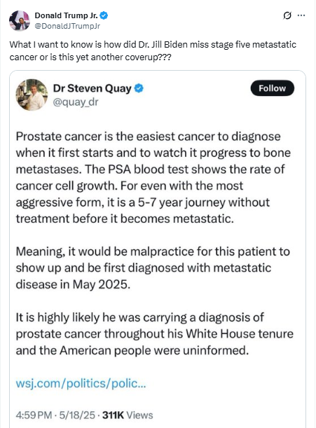புரோஸ்டேட் புற்றுநோயின் அறிகுறிகள் எளிதில் அடையாளம் காணக்கூடியவை என்பதை விளக்கும் ஒரு பதிவை டிரம்ப் ஜூனியர் சமூக ஊடகங்களில் பகிர்ந்துள்ளார். ஜோ பைடனின் புரோஸ்டேட் புற்றுநோய் எலும்புகளுக்கு பரவியதாக விவரிக்கப்பட்டுள்ள விதம், அவர் பல ஆண்டுகளுக்கு முன்பே அதைப் பற்றி அறிந்திருக்க வேண்டும் என்றும், அவர் அதிபராக இருந்தபோது இந்த தகவலை அமெரிக்க மக்களிடமிருந்து மறைத்திருக்க வேண்டும் என்றும் கூறுகிறது என்று அந்தப் பதிவில் குறிப்பிடப்பட்டுள்ளது.