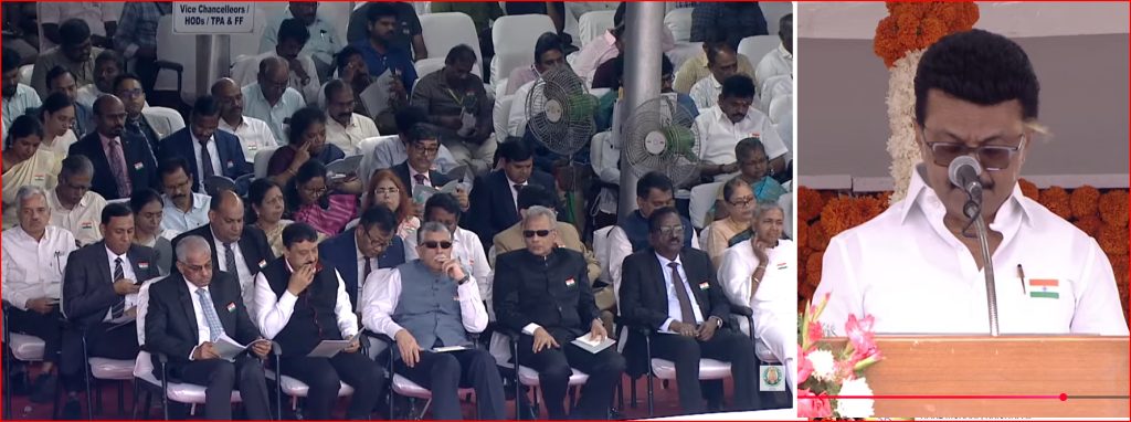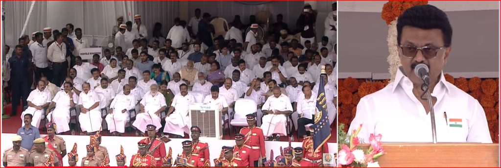 இந்த நிகழ்ச்சியில், அமைச்சர்கள் உள்ளிட்டோர் கலந்து கொண்டனர். தொடர்ந்து, சுதந்திர தினத்தையொட்டி சிறப்பு விருதுகளை முதல்வர் ஸ்டாலின் வழங்கினார்.