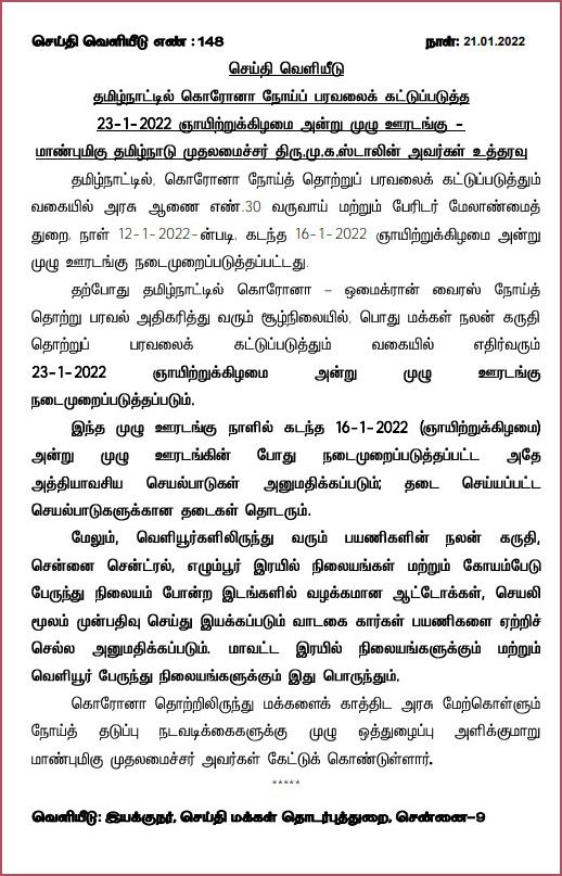 தமிழ்நாட்டில் கொரோனா, ஒமிக்ரான் வைரஸ் நோய்த் தொற்று பரவலைக் கட்டுப்படுத்த, ஞாயிற்றுக்கிழமை (23-1-2022) அன்று முழு ஊரடங்கு நடைமுறைப்படுத் தப்படும் என முதலமைச்சர் மு.க.ஸ்டாலின் அறிவித்துள்ளார். ஏற்கனவே கடந்த 2 வாரங்களாக வார இறுதி நாளான ஞாயிற்றுக்கிழமை முழு ஊரடங்கு அமல்படுத் தப்பட்ட நிலையில், வரும் ஞாயிற்றுக்கிழமையும் முழு ஊரடங்கு அமல் படுத்தப்படும் என தெரிவிக்கப்பட்டுள்ளது.