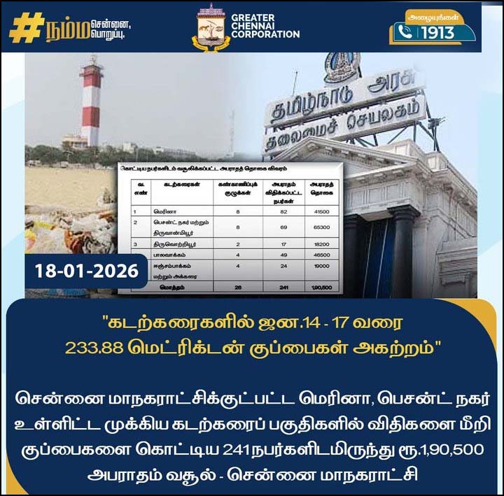எனவே, கடற்கரை பகுதிகளுக்கு வரும் பொதுமக்கள் மற்றும் சுற்றுலாப் பயணிகள் அனைவரும் தங்களது குப்பைக் கழிவுகளை, அதற்காக வைக்கப்பட்டுள்ள குப்பைத் தொட்டிகளில் மட்டும் போட்டு, மாநகராட்சியின் தூய்மைப் பணிகளுக்கு முழுமையான ஒத்துழைப்பு வழங்கிடுமாறு கேட்டுக் கொள்ளப்படுகிறார்கள்.