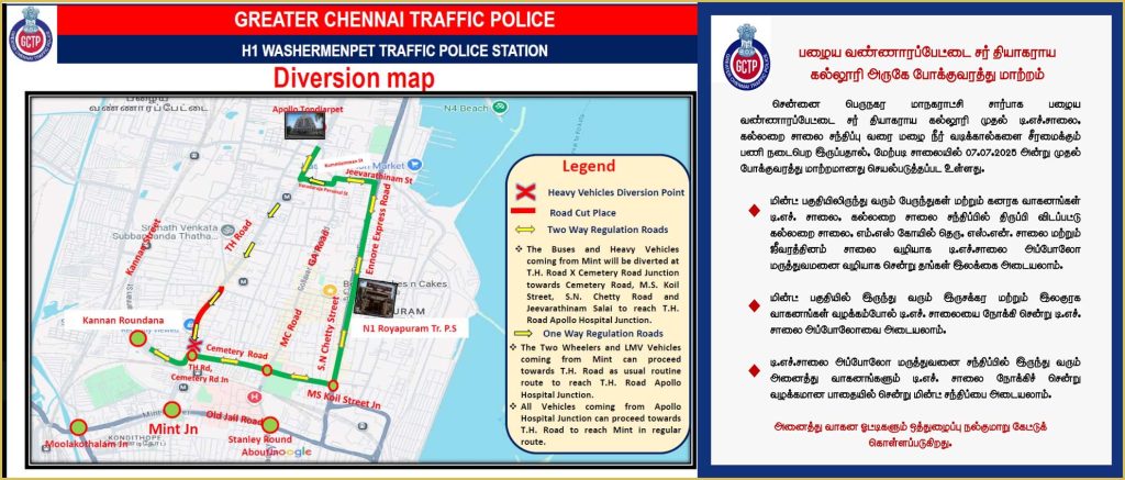இதுகுறித்து போக்குவரத்துக் காவல்துறை வெளியிட்டுள்ள அறிக்கையில் தெரிவித்ததாவது; சென்னை பெருநகர மாநகராட்சி சார்பாக பழைய வண்ணாரப் பேட்டை சர் தியாகராய கல்லூரி முதல் டி.எச்.சாலை, கல்லறை சாலை சந்திப்பு வரை மழை நீர் வடிக்கால்களை சீரமைக்கும் பணி நடைபெற இருப்பதால், மேற்படி சாலையில் 07.07.2025 இன்று முதல் போக்குவரத்து மாற்றமானது செயல்படுத்தப்பட உள்ளது.