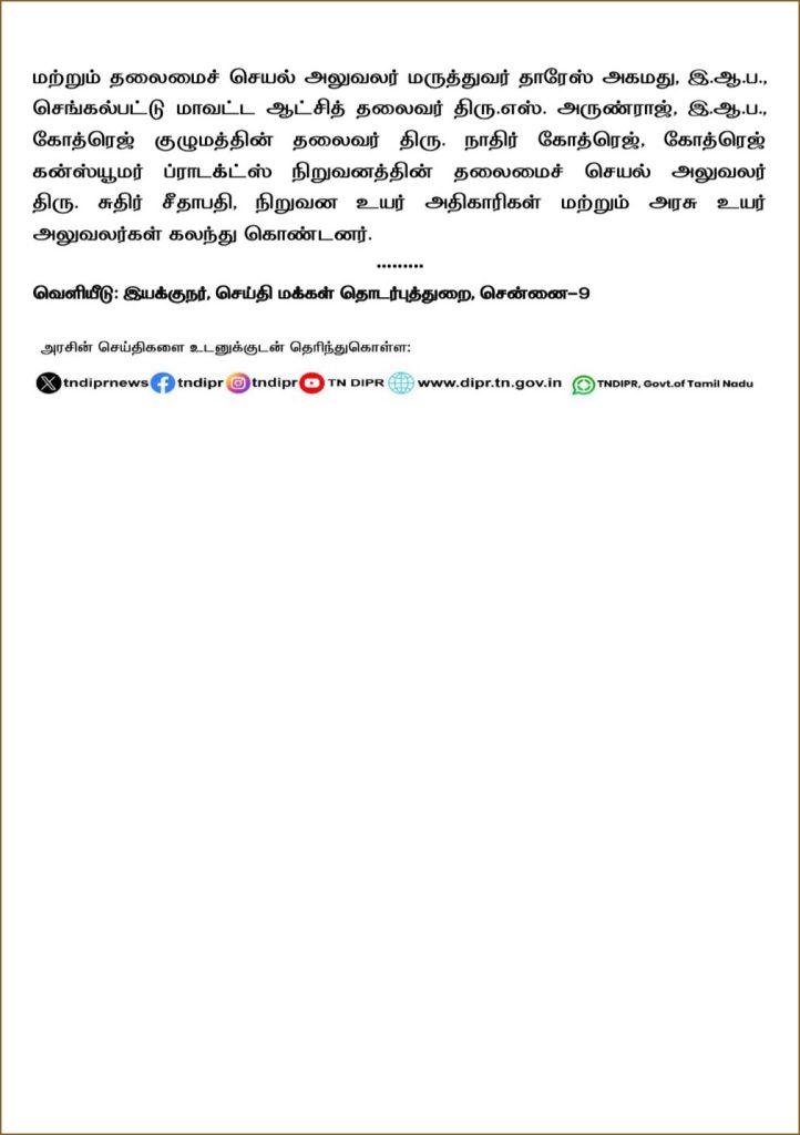 கோத்ரேஜ் கன்ஸ்யூமர் தொழிற்சாலை மாமல்லபுரம் – பையனூரில் அமைந்துள்ளது. இந்த தொழிற்சாலையை முதலமைச்சர் மு.க.ஸ்டாலின் இன்று நேரில் சென்று திறந்து வைத்தார். தொடர்ந்து, கோத்ரேஜ் தொழிற்சாலையை திறந்து வைத்து பார்வையிட்டார் .