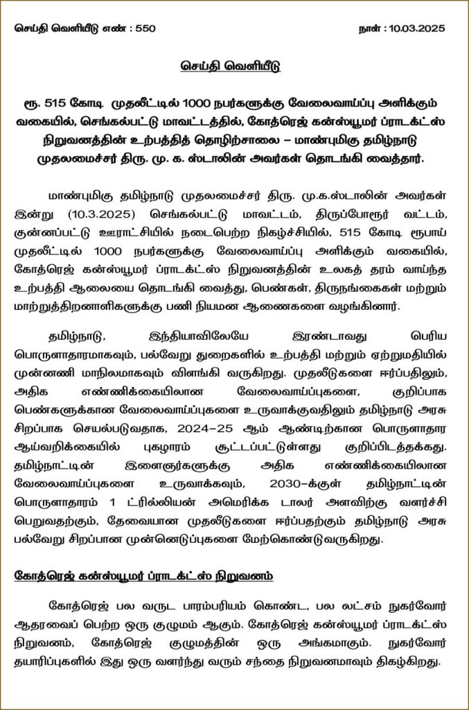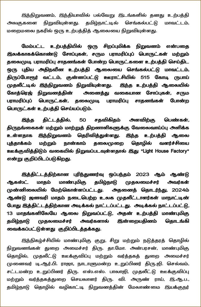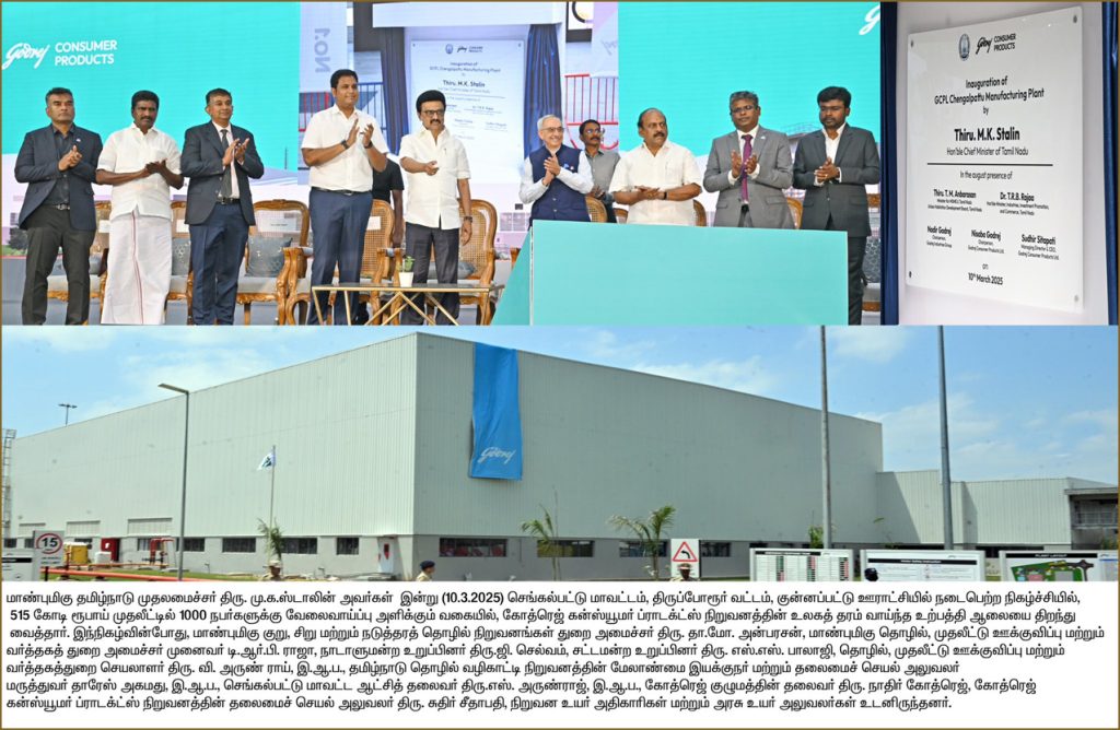 கோத்ரேஜ் கன்ஸ்யூமர் தொழிற்சாலை மாமல்லபுரம் – பையனூரில் அமைந்துள்ளது. இந்த தொழிற்சாலையை முதலமைச்சர் மு.க.ஸ்டாலின் இன்று நேரில் சென்று திறந்து வைத்தார். தொடர்ந்து, கோத்ரேஜ் தொழிற்சாலையை திறந்து வைத்து பார்வையிட்டார் .