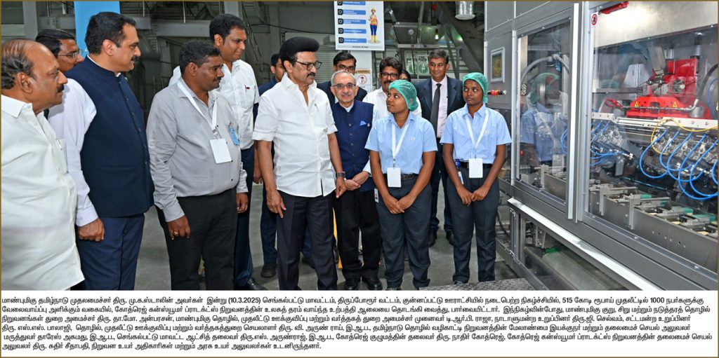சென்னை: சென்னையை அடுத்த செங்கல்பட்டு மாவட்டம் மாமல்லபுரம் – பையனூரில் அமைந்துள்ள கோத்ரேஜ் தொழிற்சாலையை முதலமைச்சர் மு.க.ஸ்டாலின் இன்று திறந்து வைத்தார்.