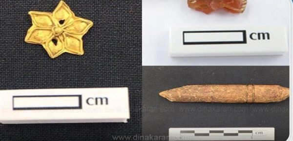 அகழாய்வு பணியின்போது இன்று மூன்று முக்கிய பொருட்கள் கண்டுபிடிக்கப்பட்டு உள்ளது. ஒரு தங்க ஆபரணத்தை முதல் முறையாக இங்குக் கண்டறிந்துள்ளனர். அது ஆறு இதழ்களைக் கொண்ட மூக்குத்தி அல்லது தோடு வடிவில் உள்ளது.