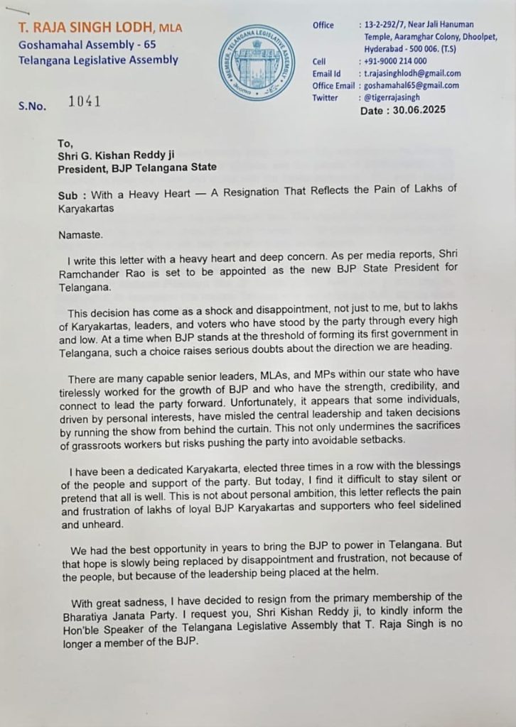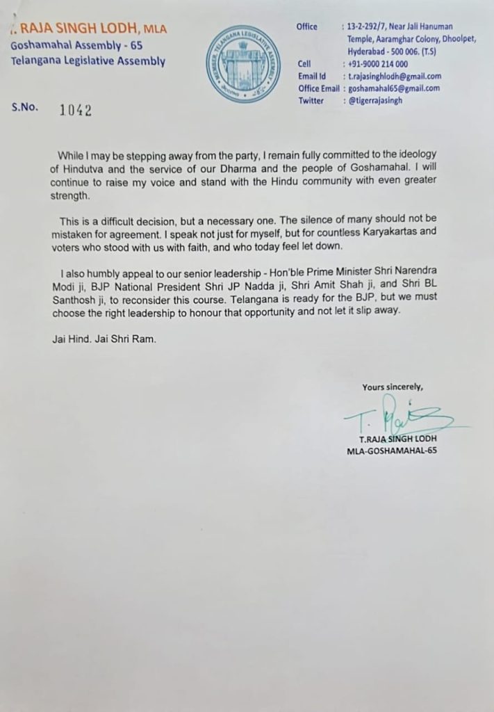 ராஜா சிங் எம்.எல்.ஏ., கட்சியில் இருந்து ராஜினாமா செய்வதாக வெளியான அறிவிப்பு அம்மாநில பாஜக-வினர் இடையே அதிர்ச்சியை ஏற்படுத்தியுள்ளது.