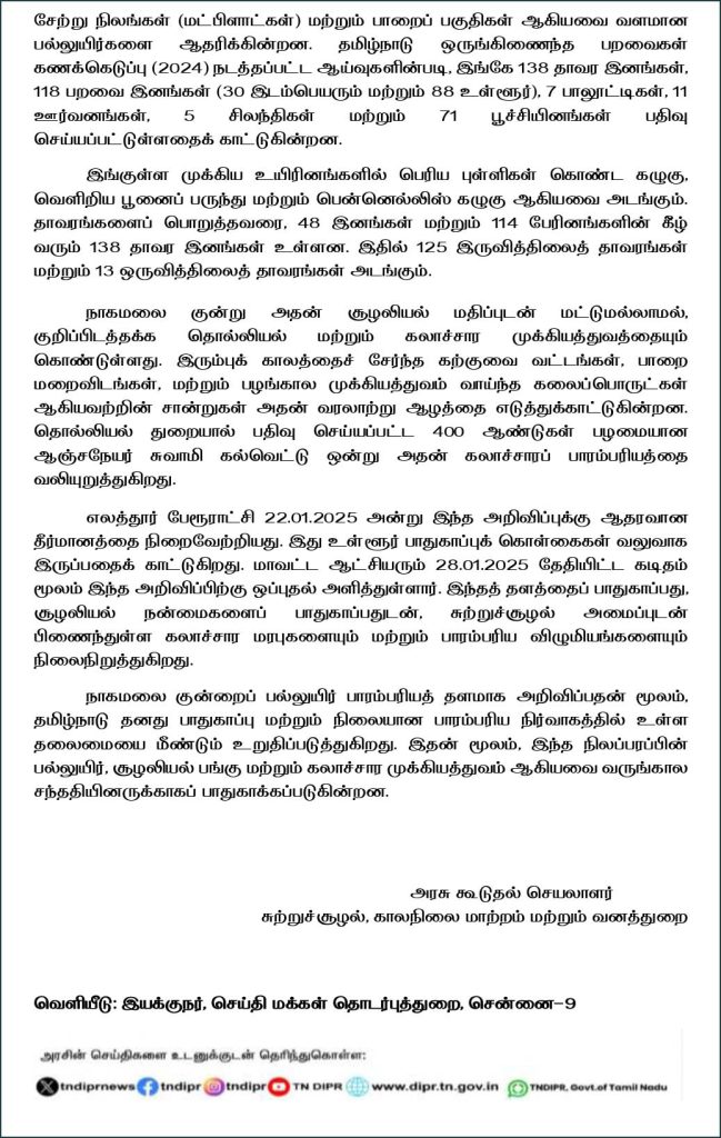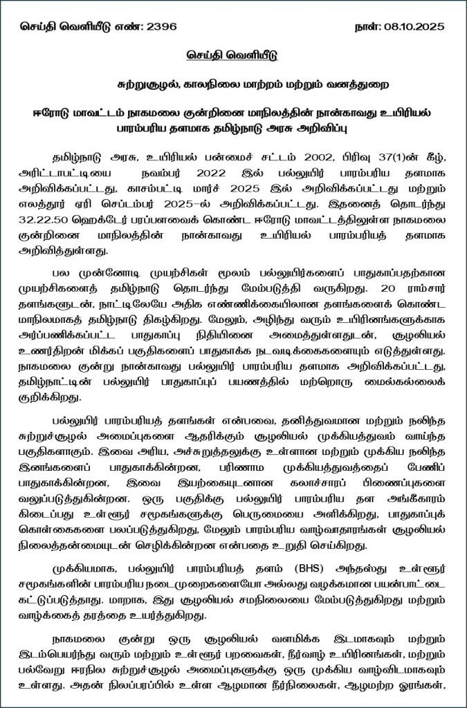 சென்னை: தமிழ்நாட்டின் 4வது பல்லுயிர் பராம்பரிய தலமாக ஈரோடு மாவட்டம் நாகமலைக் குன்று காடுகளை தமிழ்நாடு அரசு அறிவித்துள்ளது.