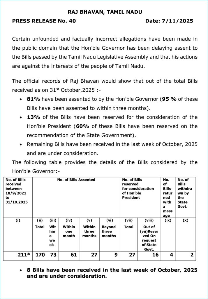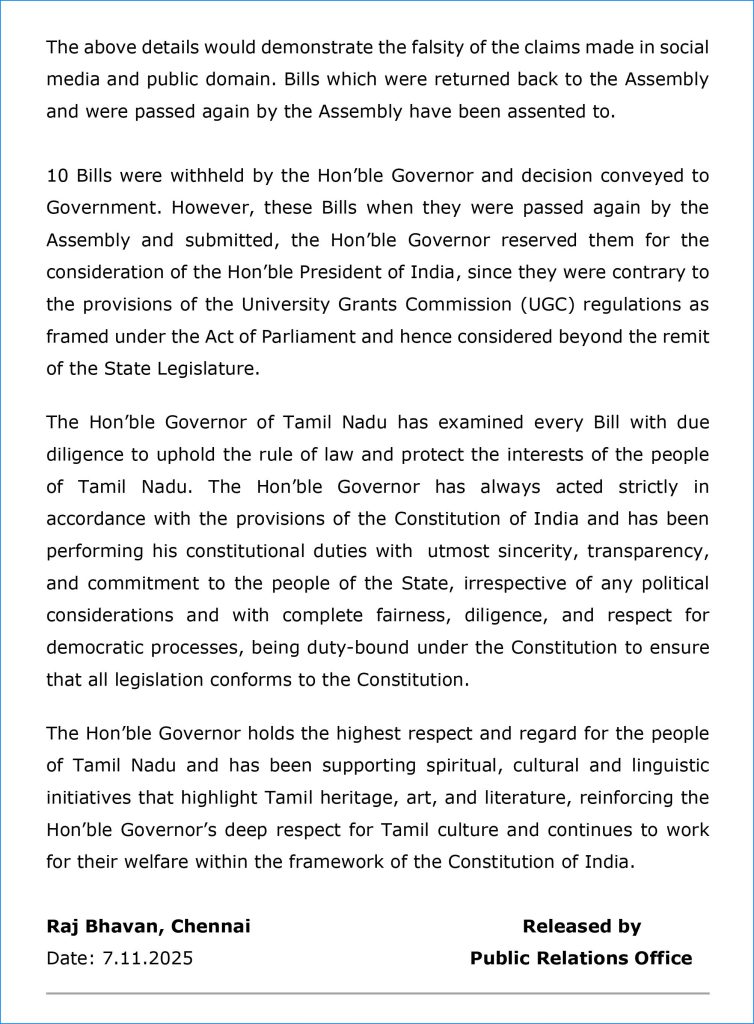 இது தொடர்பாக ஆளுநர் மாளிகை வெளியிட்டுள்ள செய்திக்குறிப்பில், “தமிழ்நாடு சட்டமன்றத்தால் நிறைவேற்றப்பட்ட மசோதாக்களுக்கு ஒப்புதல் அளிப்பதில் ஆளுநர் தாமதம் செய்து வருவதாகவும், அவரது நடவடிக்கைகள் தமிழக மக்களின் நலன்களுக்கு எதிரானவை என்றும் பொதுவெளியில் மக்கள் மத்தியில் சில ஆதாரமற்ற மற்றும் உண்மைக்கு மாறான குற்றச்சாட்டுகள் முன்வைக்கப்பட்டுள்ளன.