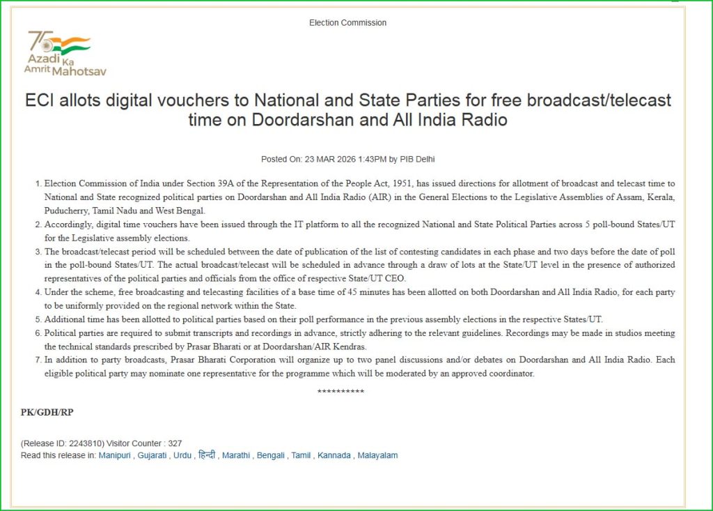 அதன்படி, தமிழ்நாடு , புதுச்சேரி, அஸ்ஸாம், கேரளா, மற்றும் மேற்கு வங்கம் ஆகிய மாநிலங்களில் நடைபெறவுள்ள சட்டமன்றத் தேர்தல்களையொட்டி, அங்கீகரிக்கப்பட்ட அரசியல் கட்சிகளுக்குத் தூர்தர்ஷன் மற்றும் அகில இந்திய வானொலியில் (AIR) இலவச ஒளிபரப்பு நேரத்தை ஒதுக்கீடு செய்வதற்கான வழிகாட்டுதல்களை இந்தியத் தேர்தல் ஆணையம் (ECI) வெளியிட்டுள்ளது.
