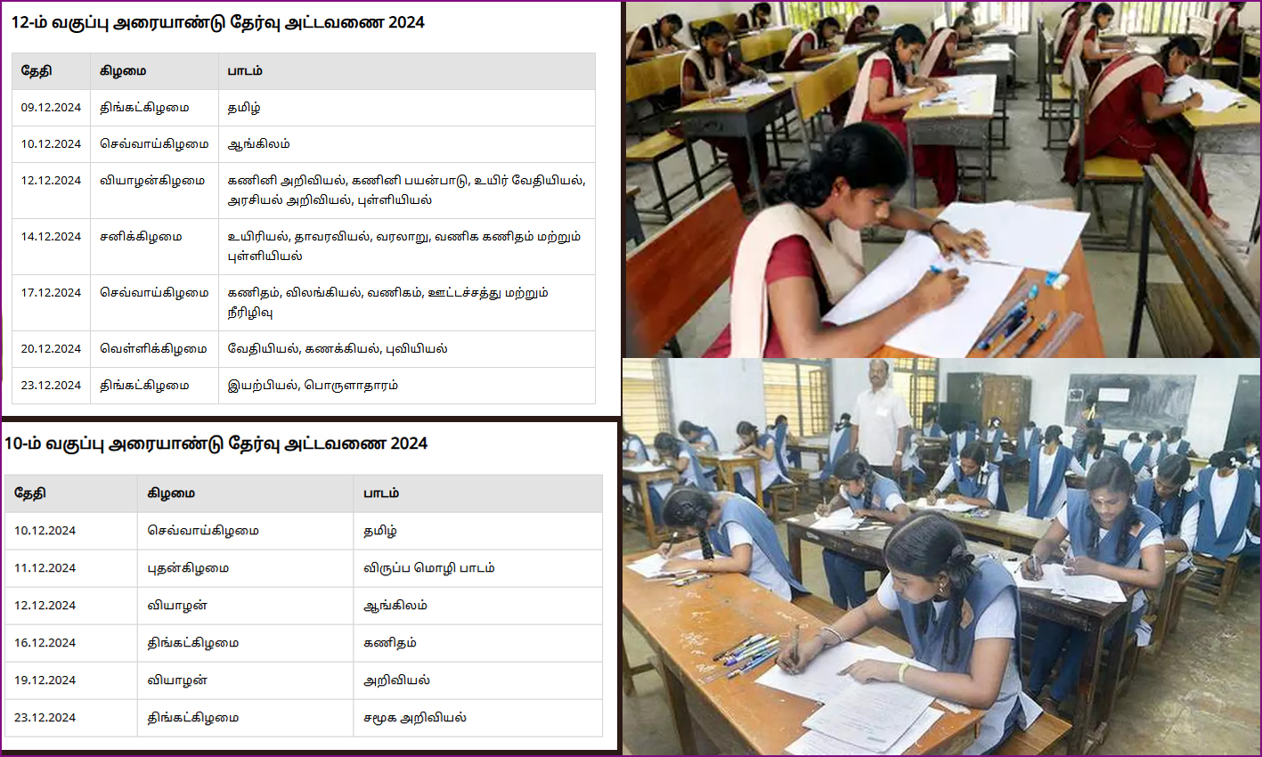 தமிழ்நாட்டில் அரசு, அரசு உதவிபெறும் பள்ளிகளில் 10 ஆம் வகுப்பு, 11 ஆம் வகுப்பு மற்றும் 12 ஆம் வகுப்புகளின் பொதுத் தேர்வுகளுக்கான அட்டவணை ஏற்கனவே வெளியிடப்பட்டுள்ள நிலையில், அற்போது அரையாண்டு தேர்வு தேதிகள் அறிவிக்கப்பட்டு உள்ளன.  அதன்படி,   10 மற்றும் 12ம் வகுப்புகளுக்கான அரையாண்டுத் தேர்வு அட்டவணை வெளியாகியுள்ளது.