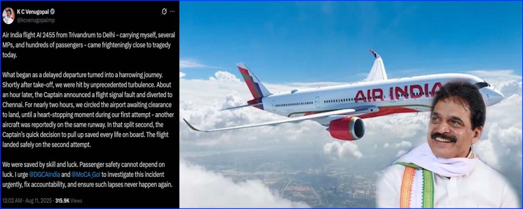 இதுகுறித்து விமானத்தில் பயணித்த காங்கிரஸ் எம்.பி.  கே.சி. வேணுகோபால், தனது எக்ஸ் (X) சமூக வலைத்தளப் பக்கத்தில், “இந்த விமானப் பயணம் விபத்திற்கு மிக அருகில் சென்றது” என்று பதிவிட்டுள்ளார். சற்று தாமதமாகப் புறப்பட்ட பயணம், பயங்கரமான பயணமாக மாறியது. புறப்பட்ட சிறிது நேரத்திலேயே எதிர்பாராத விதமான கடுமையான காற்றழுத்த சரிவில் சிக்கினோம். சுமார் 1 மணி நேரம் கழித்து, விமானி சிக்னலில் கோளாறு இருப்பதாக விமானம் சென்னைக்குத் திருப்பி விடப்படுவதாக அறிவித்தார்” என்று வேணுகோபால் குறிப்பிட்டுள்ளார்.