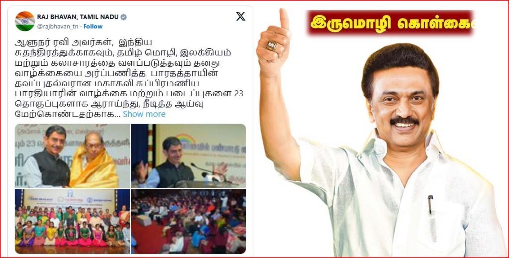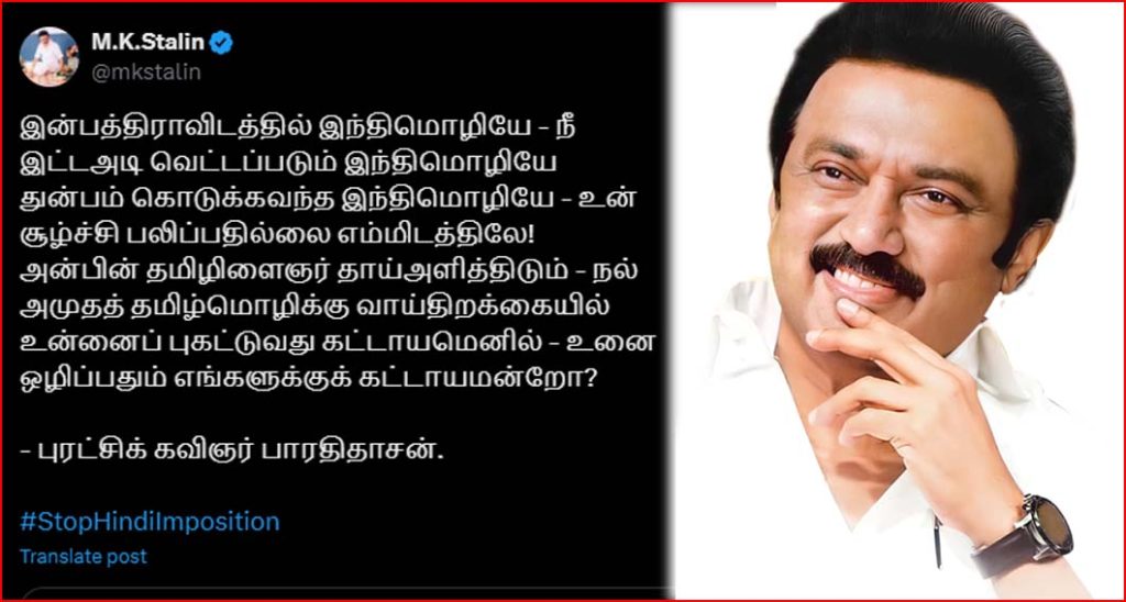 சென்னை: ஹிந்தி மொழியே! உன் சூழ்ச்சி பலிப்பதில்லை எம்மிடத்திலே!  என்ற பாரதிதாசனின் வரிகளை சுட்டிக்காட்டி கவர்னருக்கு முதலமைச்சர் பதிலடி கொடுத்துள்ளார்.