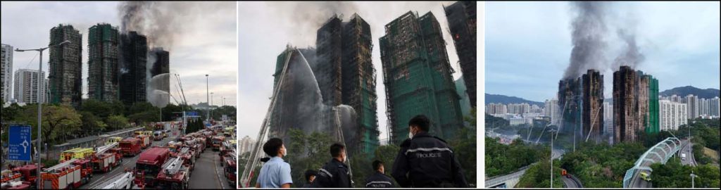 இந்த குடியிருப்பு வளாகத்தில் புதுப்பிக்கும் பணிகளுக்காக மூங்கில் சாரங்கள் மற்றும் வலைகள் கட்டப்பட்டிருந்தன. ஒரு கட்டடத்தில் இருந்த மூங்கில் சாரத்தில் நேற்று மதியம் திடீரென தீப்பற்றியது. காற்றின் வேகத்தால் அடுத்தடுத்த கட்டடங்களுக்கும் தீ மளமளவென பரவியது. ஏழு கட்டடங்களில் தீ பரவி கொழுந்து விட்டு எரிந்ததால், அந்தப்பகுதியே சிவப்பு நிறமாக காட்சியளித்ததுடன் புகை மண்டலமாக மாறியது. தகவல் அறிந்து 128 தீயணைப்பு வாகனங்களில், 767 தீயணைப்பு வீரர்கள் விரைந்து வந்து கட்டுக்கடங்காமல் எரிந்த தீயை பல மணி நேரம் போராடி அணைத்தனர்.
