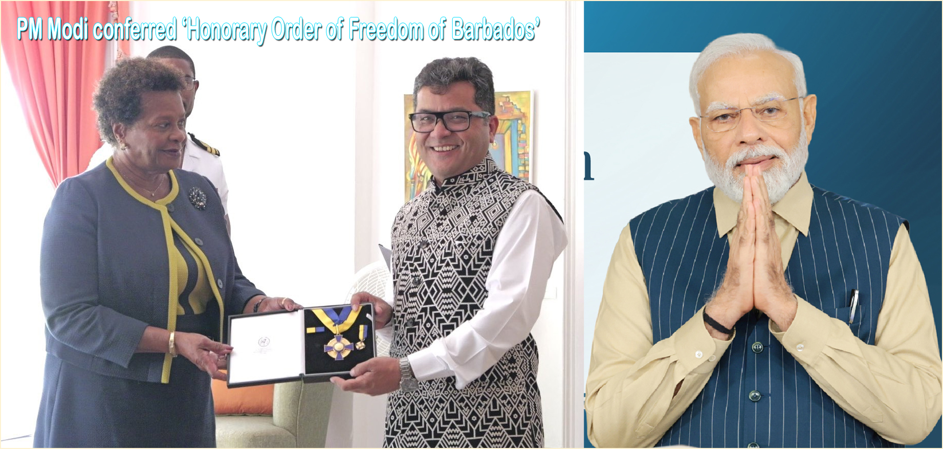 கொரோனா காலத்தில் பிரதமர் மோடியின் மூலோபாய தலைமைத்துவம் மற்றும் மதிப்புமிக்க உதவியை அங்கீகரிக்கும் விதமாக, பிரதமர் மோடிக்கு பார்படாஸின் மிக உயர்ந்த தேசிய விருது வழங்கப்பட்டது. பார்படாஸின் தலைநகரான பிரிட்ஜ்டவுனில் நடைபெற்ற விழாவில், பிரதமர் மோடியின் சார்பாக வெளியுறவு மற்றும் ஜவுளித்துறை இணையமைச்சர் பபித்ரா மார்கரிட்டா இந்த விருதைப் பெற்றார்.