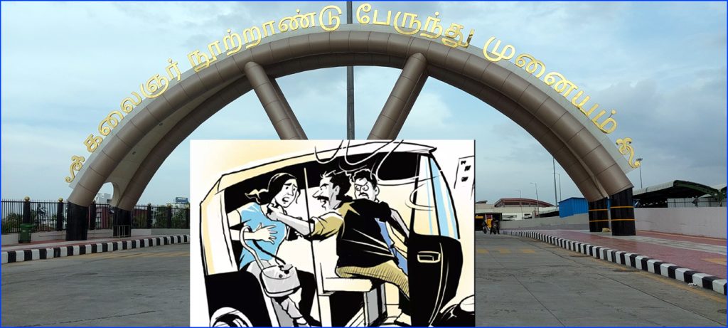 சென்னையின் புறநகர் பேருந்து நிலையமாக கிளாம்பாக்கம் மாற்றப்பட்ட பிறகு, மற்ற மாவட்டங்களுக்கு செல்ல வேண்டுமென்றால் கிளாம்பாக்கத்தில் உள்ள கலைஞர் நூற்றாண்டு பேருந்து நிலையம் செல்ல வேண்டிய கட்டாயம் ஏற்பட்டுள்ளது. மிகப்பெரிய பேருந்து நிலையமான இங்கு  இரவு நேரங்களில் போதிய பாதுகாப்பு இல்லாத நிலை உள்ளது. இந்த நிலையில்தான் இளம்பெண் ஒருவரை ஆட்டோ டிரைவர்கள் கத்திமுனையில் ஆட்டோவில் ஏற்றிச்சென்று பாலியல் சேட்டை வந்தது, பெண்ணின் சத்தம் கேட்டு, அந்த பகுதியைச்சேர்ந்த கொடுத்த புகாரின் பேரில் ஆட்டோவை மடக்கிய காவல்துறையினர்,.முத்தமிழ்ச்செல்வன், தயாளன் ஆகிய  இரு ஆட்டோ டிரைவர்களை கைது செய்துள்ளனர். இது பெரும் பரபரப்பை ஏற்படுத்தி உள்ளது. கிளாம்பாக்கம் பேருந்து நிலையத்திற்கு இரவு நேரம் வரும் பெண்களின் பாதுகாப்பு கேள்விக்குறியாகி உள்ளது.