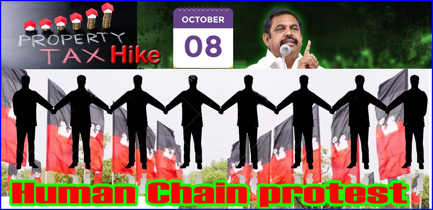 40 மாத காலமாக தமிழக மக்கள் பல்வேறு இன்னல்களை சந்தித்து வருவதற்குக் காரணமான திரு. ஸ்டாலினின் திமுக அரசைக் கண்டித்தும்; மக்கள் நலன் கருதி உயர்த்தப்பட்ட சொத்து வரியை உடனடியாக திரும்பப் பெற வலியுறுத்தியும், அனைத்திந்திய அண்ணா திராவிட முன்னேற்றக் கழகத்தின் சார்பில் அனைத்து மாநகராட்சிகளுக்கு உட்பட்ட வட்டங்களிலும்; நகராட்சிகள் மற்றும் பேரூராட்சிகளிலும் மாபெரும்  8.10.2024 – செவ்வாய் கிழமை காலை 10.30 மணிக்கு மனித சங்கிலிப் போராட்டம் நடைபெறும் என அறிவிக்கப்பட்டுள்ளது.
