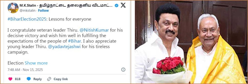 பாட்னா: பீகாரில் என்டிஏ கூட்டணி ஆட்சியை தக்க வைத்தது.  வரலாறு காணாத அளவில் 202 இடங்களில் வெற்றி பெற்றுள்ளது. காங்கிரஸ், ஆர்ஜேடி கூட்டணியான மகாபந்தன் கூட்டணி தோல்வியை சந்தித்துள்ளது. இதன் காரணமாக பீகார் சட்டமன்றத்தில் எதிர்க்கட்சி அந்தஸ்தையும் இழந்துள்ளது. இதையடுத்து முதல்வர் நிதிஷ்குமாருக்கு வாழ்த்துக்கள் குவிந்து வருகிறது. இந்த நிலையில்,  பீகாரில் மீண்டும் வெற்றியை வசப்படுத்தியுள்ள நிதிஷ்குமாருக்கு முதல்வர் மு.க.ஸ்டாலின் வாழ்த்து தெரிவித்துள்ளார்.