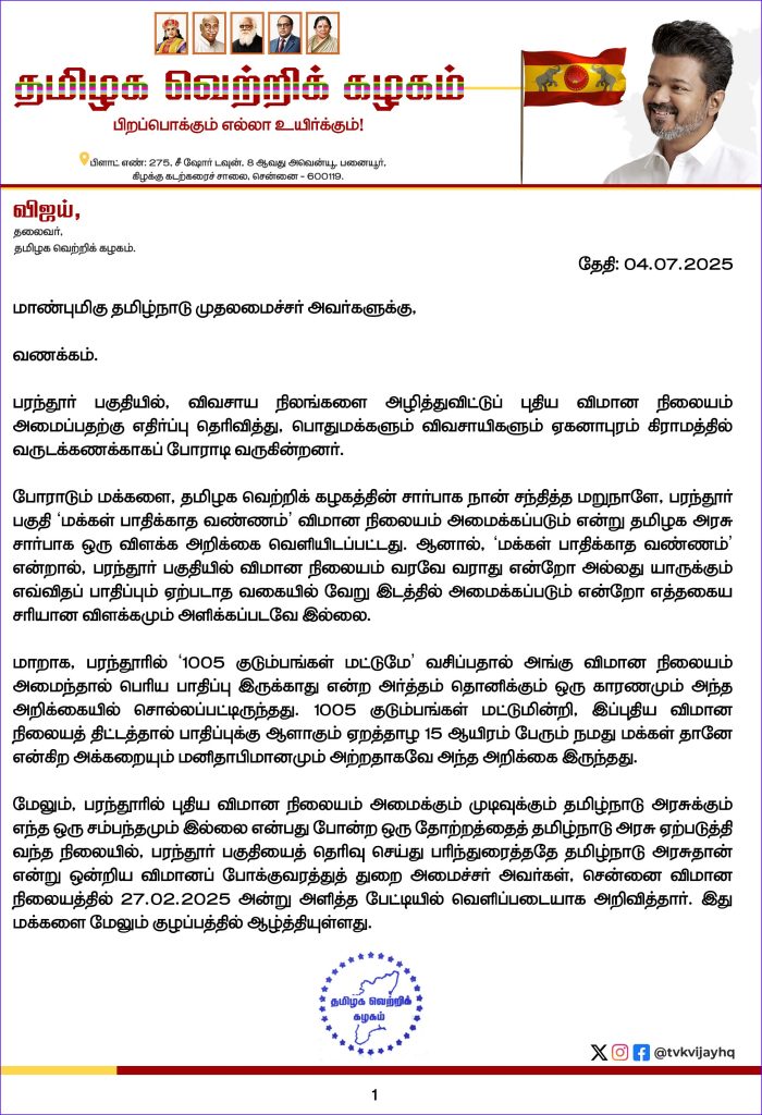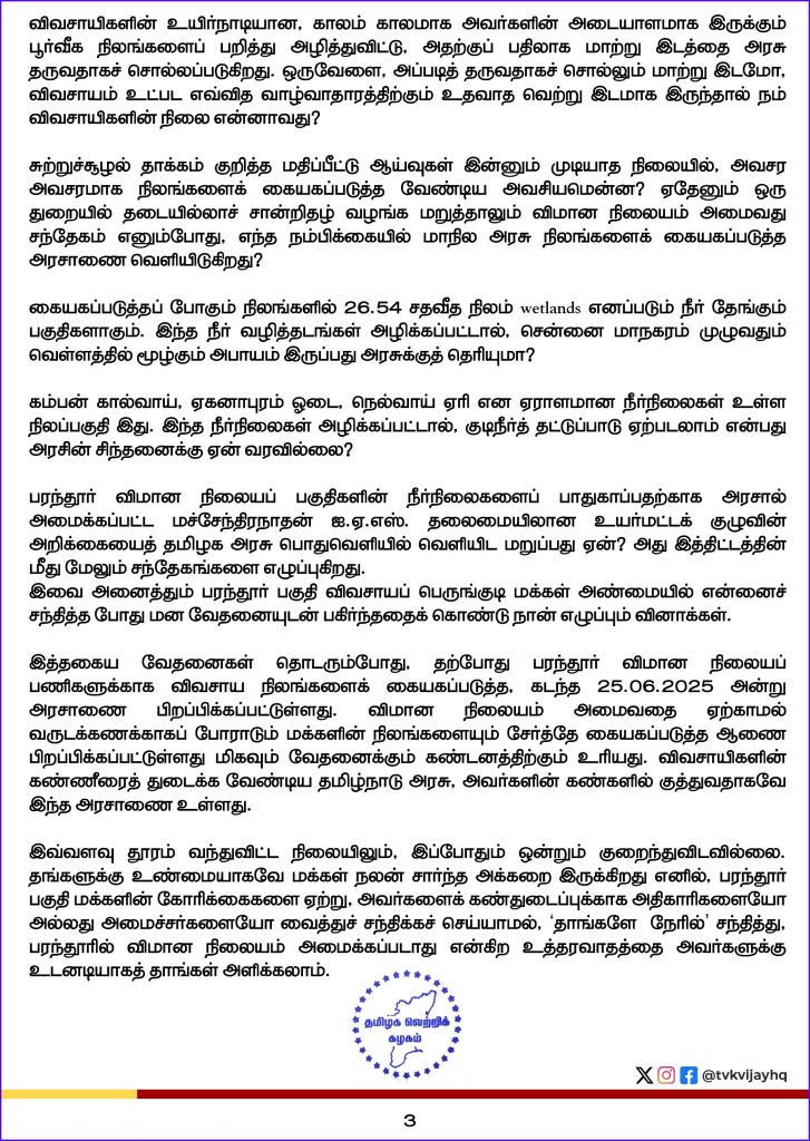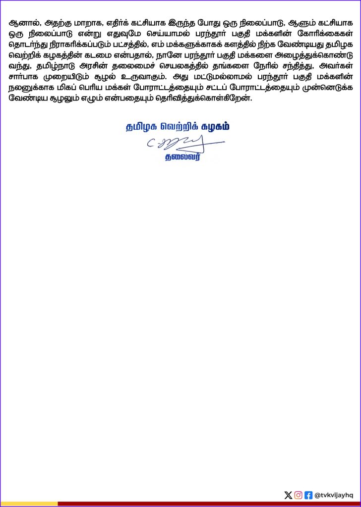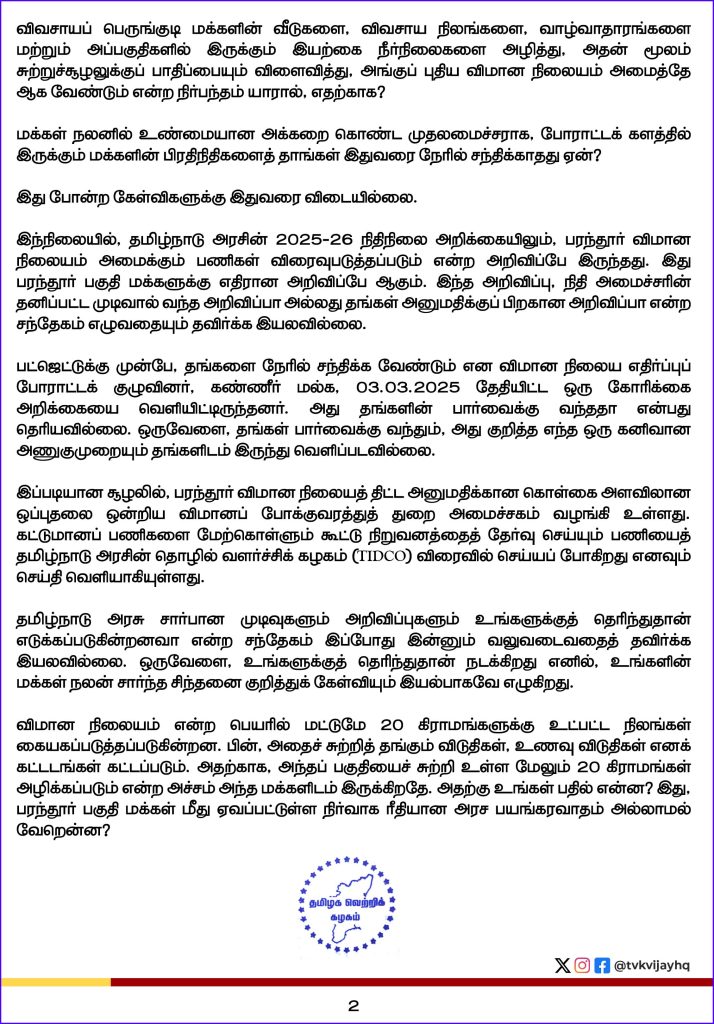ஆனால், அதற்கு மாறாக, எதிர்க் கட்சியாக இருந்த போது ஒரு நிலைப்பாடு, ஆளும் கட்சியாக ஒரு நிலைப்பாடு என்று எதுவுமே செய்யாமல் பரந்தூர் பகுதி மக்களின் கோரிக்கைகள் தொடர்ந்து நிராகரிக்கப்படும் பட்சத்தில், எம் மக்களுக்காகக் களத்தில் நிற்க வேண்டியது தமிழக வெற்றிக் கழகத்தின் கடமை என்பதால், நானே பரந்தூர் பகுதி மக்களை அழைத்துக்கொண்டு வந்து, தமிழ்நாடு அரசின் தலைமைச் செயலகத்தில் தங்களை நேரில் சந்தித்து, அவர்கள் சார்பாக முறையிடும் சூழல் உருவாகும். அது மட்டுமல்லாமல் பரந்தூர் பகுதி மக்களின் நலனுக்காக மிகப் பெரிய மக்கள் போராட்டத்தையும் சட்டப் போராட்டத்தையும் முன்னெடுக்க வேண்டிய சூழலும் எழும் என்பதையும் தெரிவித்துக்கொள்கிறேன்”