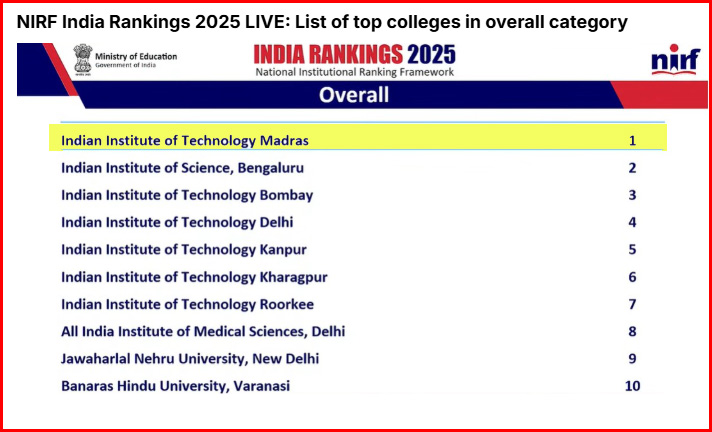 என்.ஐ.ஆர்.எஃப் (NIRF) தரவரிசை – சென்னை ஐஐடி முதலிடம் பிடித்துள்ளது. 2025 தேசிய நிறுவனங்களின் தரவரிசை பட்டியல் வெளியிடப்பட்டுள்ள நிலையி்ல, இதில் சென்னை IIT மீண்டும் முதலிடத்தை பிடித்துள்ளது பெங்களூரு இந்திய அறிவியல் நிறுவனம் 2வது இடம் பிடித்துள்ளது, மும்பை ஐஐடி 3வது இடம், டெல்லி ஐஐடி 4வது இடம் பிடித்துள்ளது