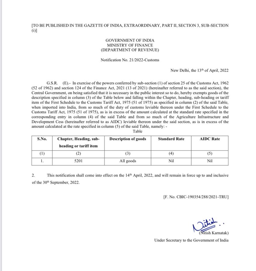 டெல்லி: பருத்தி இறக்குமதிக்கான சுங்க வரியை முழுமையாக ரத்து செய்து மத்திய அரசு உத்தரவிட்டுள்ளது. இந்த ரத்தானது செப்டம்பர் மாதம் வரை மட்டுமே என்பதையும் தெரிவித்து உள்ளது.