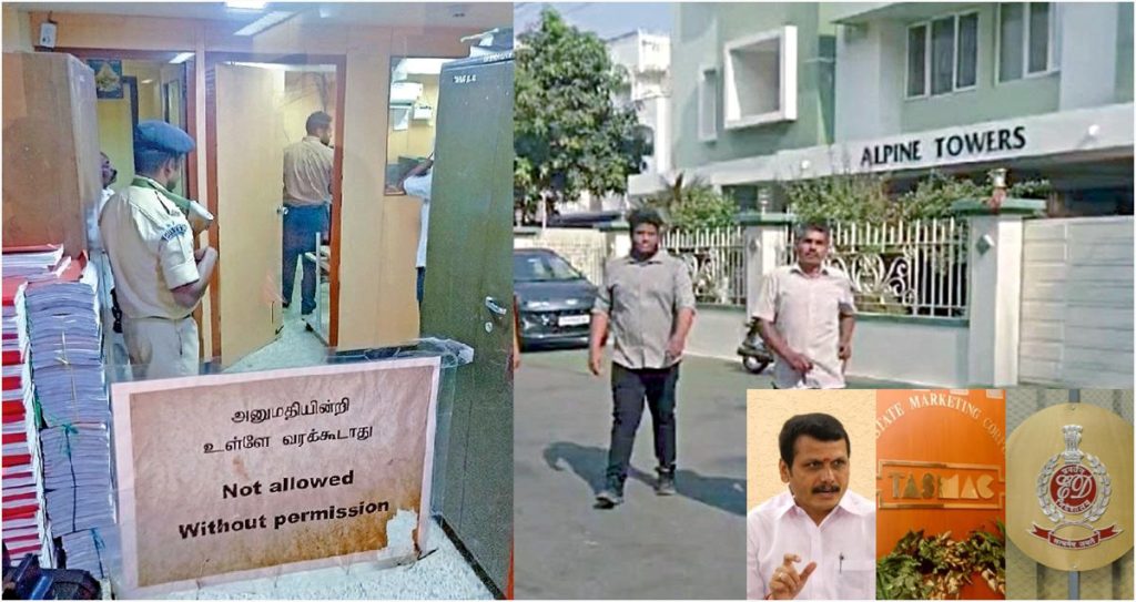 இந்த  சட்ட விரோத பண பரிவர்த்தனை தொடர்பாக அமைச்சர் செந்தில் பாலாஜி, திமுக எம்.பி. ஜெகத்ரட்சகன் ஆகியோருடன் தொடர்புடைய இடங்களில் அமலாக்கத் துறை அதிகாரிகள் நேற்று சோதனை நடத்தினர். சென்னையில் உள்ள டாஸ்மாக் தலைமை அலுவலகம், கோவையில் தனியார் மதுபான ஆலை, கரூரில் அரசு ஒப்பந்ததாரர்கள் வீடு என 10 இடங்களில் இந்த சோதனை நடத்தப்பட்டுள்ளது.
