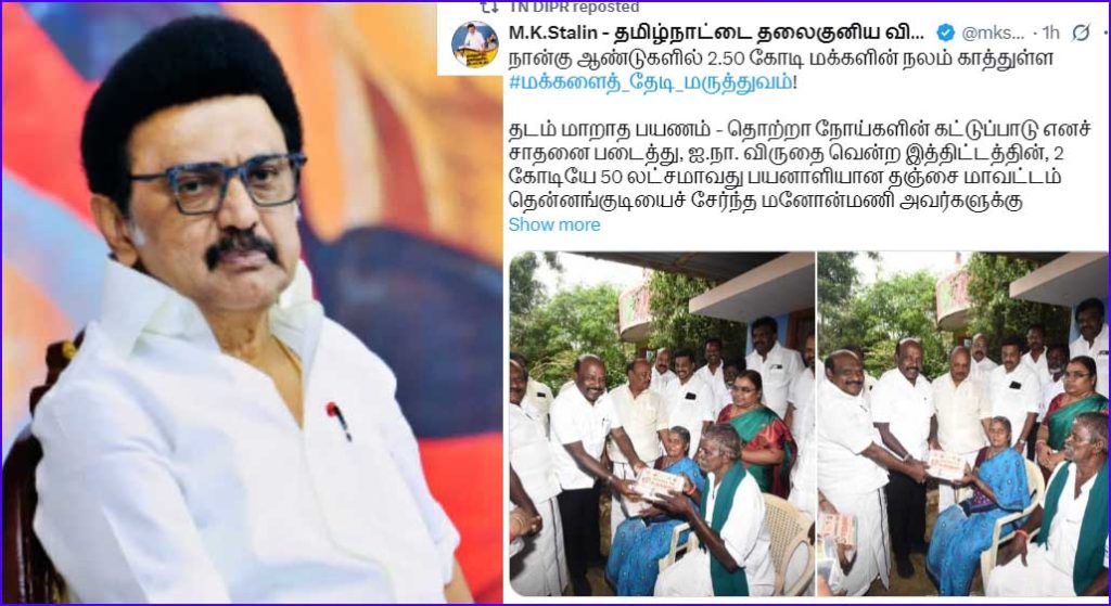 நான்கு ஆண்டுகளில் 2.50 கோடி மக்களின் நலம் காத்துள்ள #மக்களைத்_தேடி_மருத்துவம்! தடம் மாறாத பயணம் – தொற்றா நோய்களின் கட்டுப்பாடு எனச் சாதனை படைத்து, ஐ.நா. விருதை வென்ற இத்திட்டத்தின், 2 கோடியே 50 லட்சமாவது பயனாளியான தஞ்சை மாவட்டம் தென்னங்குடியைச் சேர்ந்த மனோன்மணி அவர்களுக்கு மருந்துப் பெட்டகத்தை வழங்கியுள்ள மாண்புமிகு