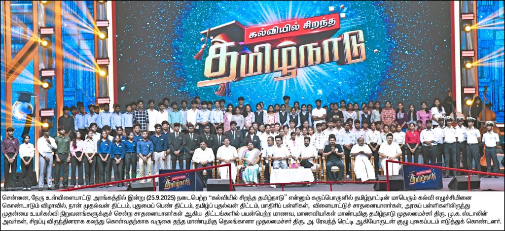 சென்னை: தமிழகத்தின் கல்வி எழுச்சியை இந்தியாவே திரும்பி பார்க்கிறது . சிலர் அதற்கு தடை ஏற்படுத்த நினைக்கிறார்கள், அவர்களுக்கு பயத்தை காட்ட வேண்டும் என ‘கல்வியில் சிறந்த தமிழ்நாடு’  நிகழ்ச்சியில் முதலமைச்சர் ஸ்டாலின் கூறினார்.