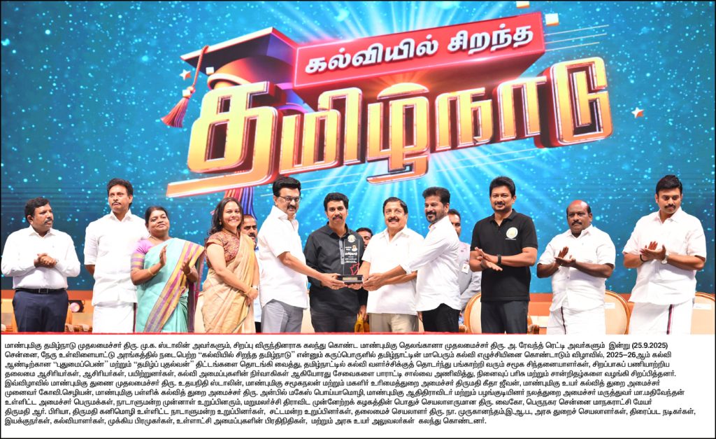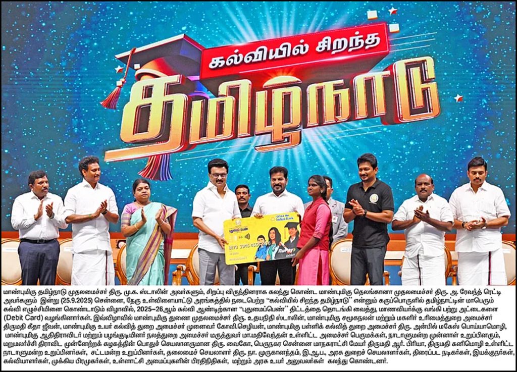2025-26 கல்வி ஆண்டிற்கான “புதுமைப்பெண் – தமிழ்ப் புதல்வன்” திட்டங்களின் தொடக்கவிழா  நேற்று  (25.9.2025) மாலை 4.00 மணியளவில் சென்னை, ஜவஹர்லால் நேரு உள்விளையாட்டு அரங்கில் தொடங்கியது.