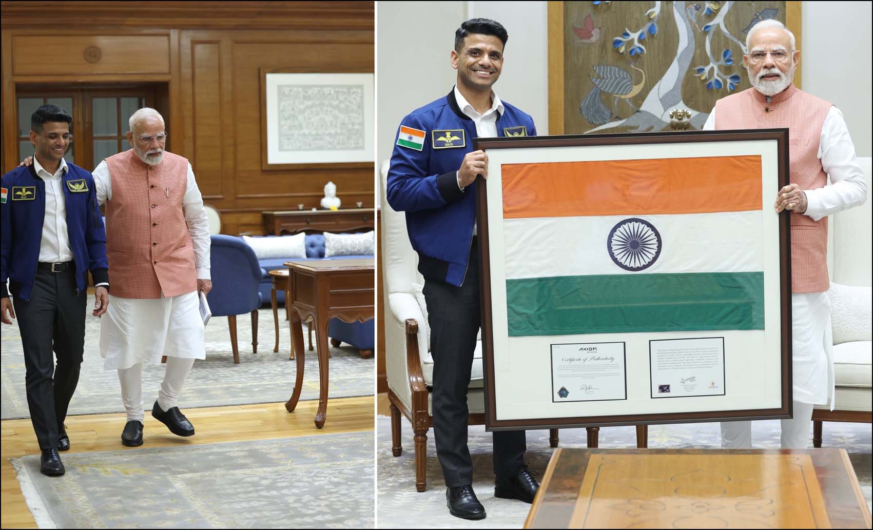 அப்போது,   சுக்லா பிரதமருக்கு ஆக்சியம்-4 மிஷனின் மிஷன் பேட்ச் மற்றும் ஐ.எஸ்.எஸ்-க்கு எடுத்துச் சென்ற இந்திய மூவர்ணக் கொடியை பரிசாக வழங்கினார். ஏற்கனவே  ஜூன் 29 அன்று சுக்லா  விண்வெளியில் இருந்து இந்திய மோடியுடன் உரையாடியபோது, ஐ.எஸ்.எஸ்ஸில் பின்னணியில் இந்த இந்திய மூவர்ணக் கொடி பறந்து கொண்டிருந்தது. அந்த கொடியையே சுக்லா பிரதமரிடம் வழங்கினார்.