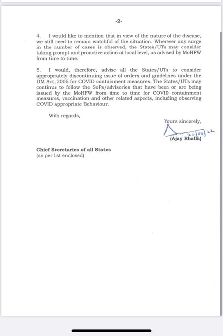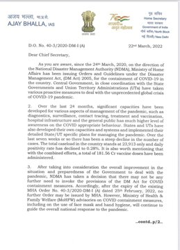 இதுதொடர்பாக மத்திய உள்துறைசெயலாளர் அஜய்பல்லா, மாநில தலைமைச்செயலாளர்களுக்கு கடிதம் எழுதி உள்ளார். அதில், கொரோனா பரவலைக் கட்டுப் படுத்த எடுக்கப்பட்ட நடவடிக்கைகளின் பயனாக, நாடு முழுவதும் கரோனா பாதிப்பு விகிதம் குறைந்து வருவதைக் கருத்தில் கொண்டு, இதுவரை பின்பற்றப்பட்டு வந்த கட்டுப்பாடுகளையும் இனியும் தொடர வேண்டிய அவசியமில்லை என்று தேசிய பேரிடர் மேலாண்மை ஆணையம்  முடிவெடுத்திருப்ப தாகக் குறிப்பிடப் பட்டுள்ளது.