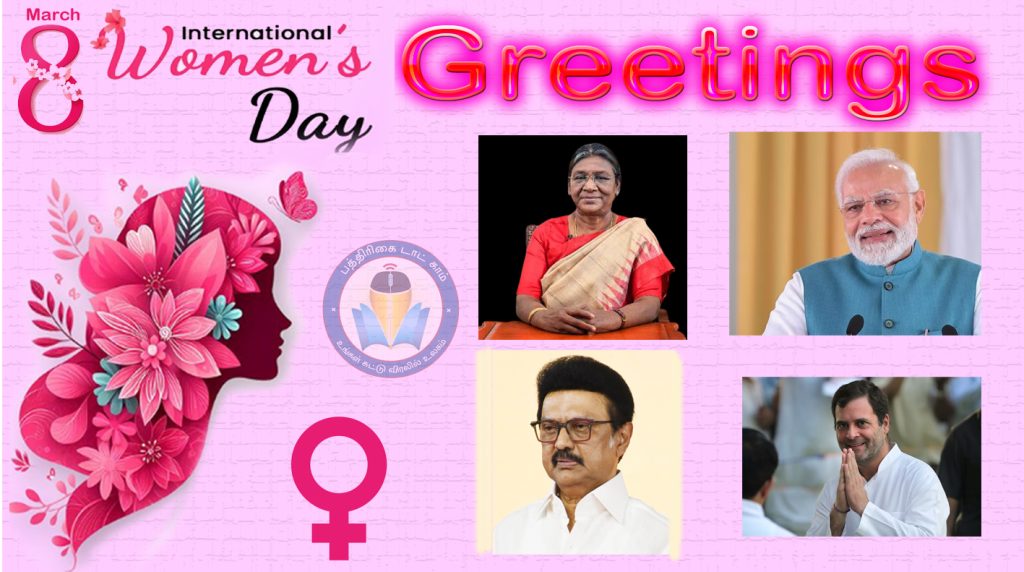 . இதையொட்டி, இந்திய குடியரசு தலைவர் திரவுபதி முர்மு, பாரத பிரதமர் மோடி, மக்களவை எதிர்க்கட்சி தலைவர் ராகுல்காந்தி, தமிழக முதல்வர் ஸ்டாலின் உள்பட இந்திய மற்றும் தமிழக அரசியல் கட்சி தலைவர்கள் பெண்களுக்கு தங்களது வாழ்த்துக்ளை தெரிவித்துள்ளனர்.