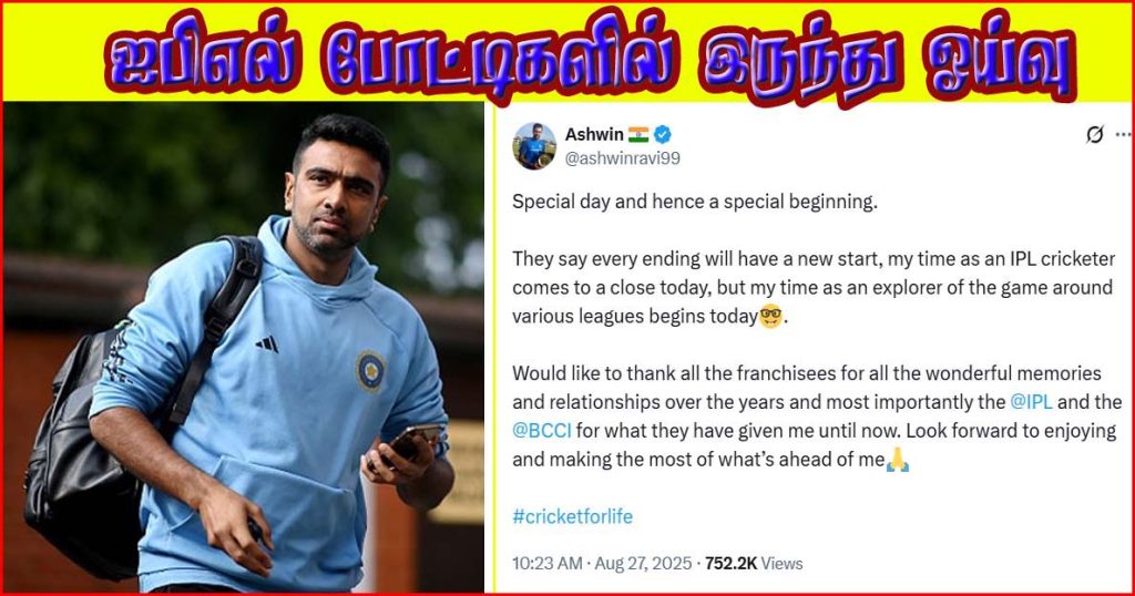 இந்த அண்டு சிஎஸ்கே அணி சார்பாக ஐபிஎல் போட்டியில் ஆடிய நிலையில், அடுத்த ஆண்டு (2026) ஐபிஎல் ஏலத்திற்கு முன்னதாக ராஜஸ்தான் ராயல்ஸுக்கு அவர் திரும்புவார் என்று வதந்திகள் பரவிய நிலையில், ஐபிஎல்லில் இருந்து விலகும் அஸ்வின் முடிவு அறிவித்து உள்ளார். இது அவரது ரசிகர்களுக்கு அதிர்ச்சியை அளிக்கிறது.