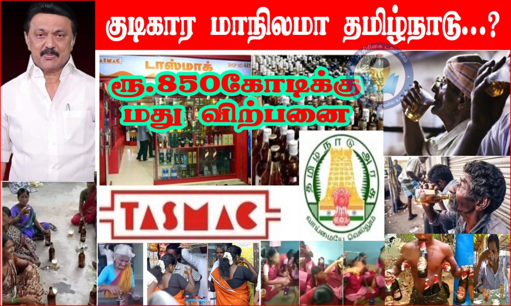 தமிழ்நாடு அரசு ஊருக்கு ஊர் டாஸ்மாக் கடைகளை திறந்து வைத்து, பொதுமக்களை குடிகாரர்களாக்கி வருகிறரு. தமிழர்களின் பாரம்பரிய பண்டிகைகளான தீபாவளி, பொங்கல் கொண்டாட்டத்தின் ஒரு அங்கமாக மதுபானம் இடம் பெற்று வரும் அளவுக்கு தமிழ்நாட்டில் மது விற்பனையும், மதுப்பிரியர்களும் அதிகரித்து உள்ளனர். இது இளைய தலைமுறையினரின் எதிர்காலத்திற்கான முட்டுக்கடையாக கருதப்படுகிறது.