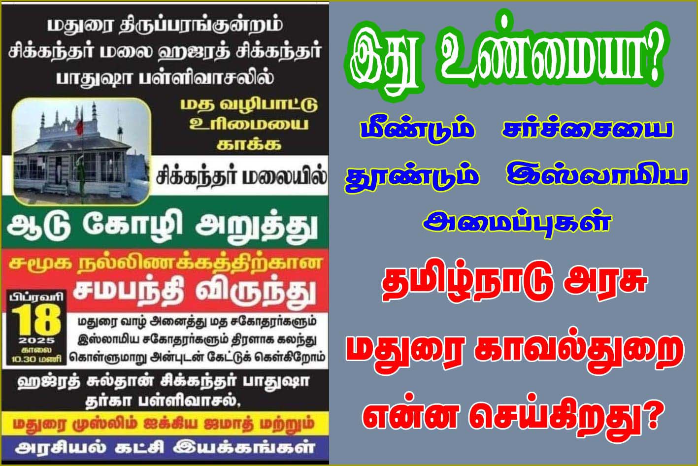 திருப்பரங்குன்றம் முருகன் கோயில் அமைந்துள்ள குமரன் மலையில், எவ்விதமான உயிர் பலியும் செய்வது கிடையாது. அதுபோல மலையின் உச்சியில் சிக்கந்தர் பாதுஷா தர்கா அமைந்துள்ளது. இங்கும் அந்த பகுதியைச்சேர்ந்த இஸ்லாமியர்கள் சென்று தொழுகை நடத்தி வருகின்றன. ஆனால், 2025 ஜனவரி மாதம் சில இஸ்லாமிய அமைப்புகள், சிக்கந்தர் பாதுஷா தர்காவின் சார்பில் சர்ச்சைக்குரிய வகையில் நோட்டீஸ் மற்றும் போஸ்டர் விநியோகம் செய்தது. அதில், ஜனவரி 18-ம் தேதி ஆடு மற்றும் கோழிகளை பலியிட்டு, சமபந்தி உணவு வழங்கப்படுவதாக குறிப்பிடப்பட்டிருந்தது. இது பெரும் சர்ச்சையை ஏற்படுத்தியது.