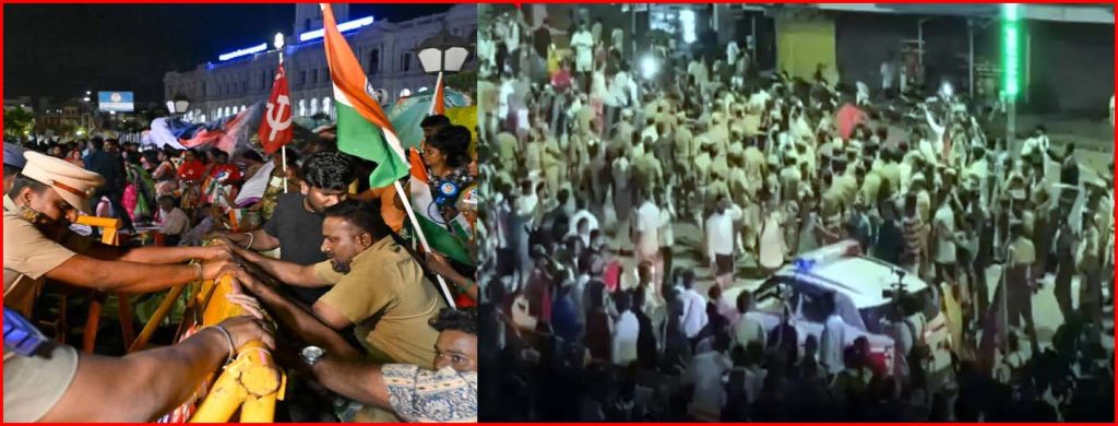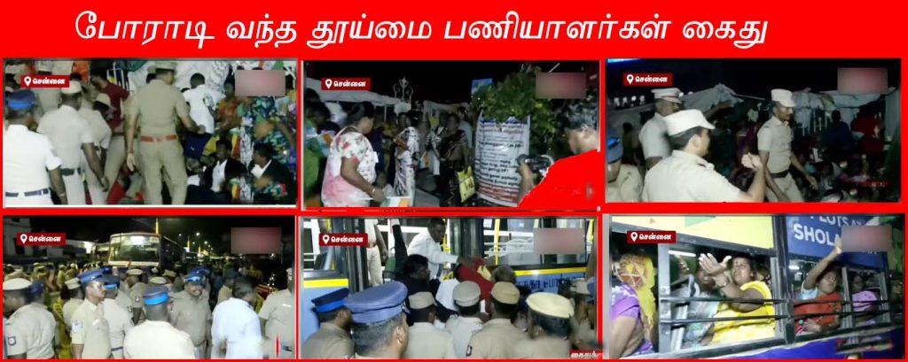 சென்னை ரிப்பன் மாளிகை முன்பு கடந்த 13 நாட்களாக போராட்டம் நடத்தி வந்த தூய்மைப் பணியாளர்களை. உயர்நீதிமன்ற உத்தரவின் பேரில் காவல்துறை கைது செய்து நடவடிக்கை எடுத்துள்ளார். அவர்களை வேறு இடத்திற்கு சென்று போராட நீதிமன்றம் அனுமதி வழங்கிய நிலையில், அதை ஏற்க மறுத்து தூய்மை பணியாளர்கள் தொடர்ந்து போராடியதால், அவர்களை காவல்துறையினர் வலுக்கட்டாயமாக இழுத்துச்சென்று கைது செய்தனர். இது தொடர்பான வீடியோக்கள் வைரலாகி வருகிறது.