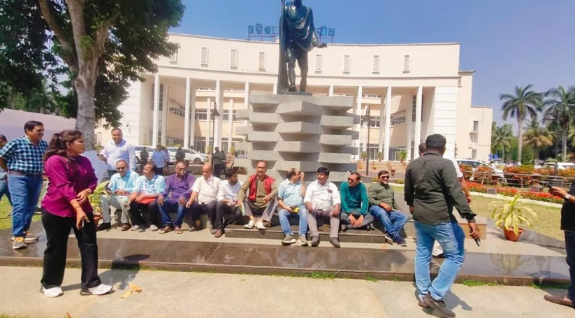 மொபைல் போன் இல்லாமல் எங்கள் பணியை மேற்கொள்வது சாத்தியமில்லை. அரசாங்கம் தனது முடிவை மறுபரிசீலனை செய்து பத்திரிகையாளர் கேலரிக்குள் மொபைல் போன் பயன்பாட்டை அனுமதிக்க வேண்டும்” என்று வலியுறுத்தி சட்டமன்ற வளாகத்தில் உள்ள காந்தி சிலை முன் தர்ணாவில் ஈடுபட்டனர்.