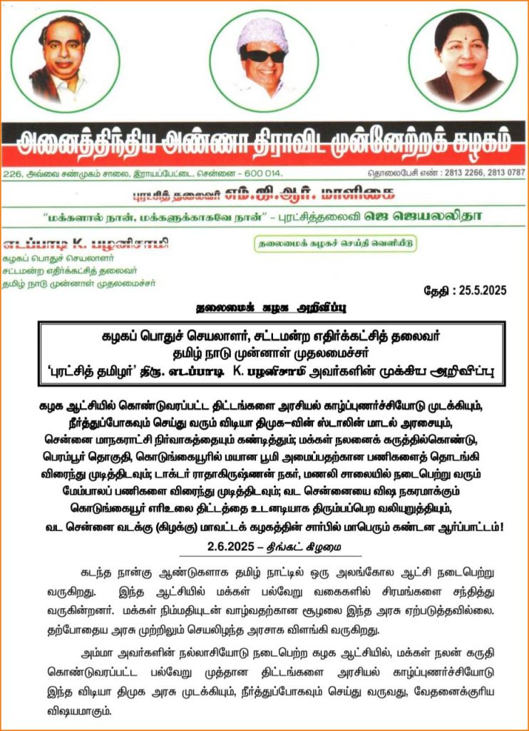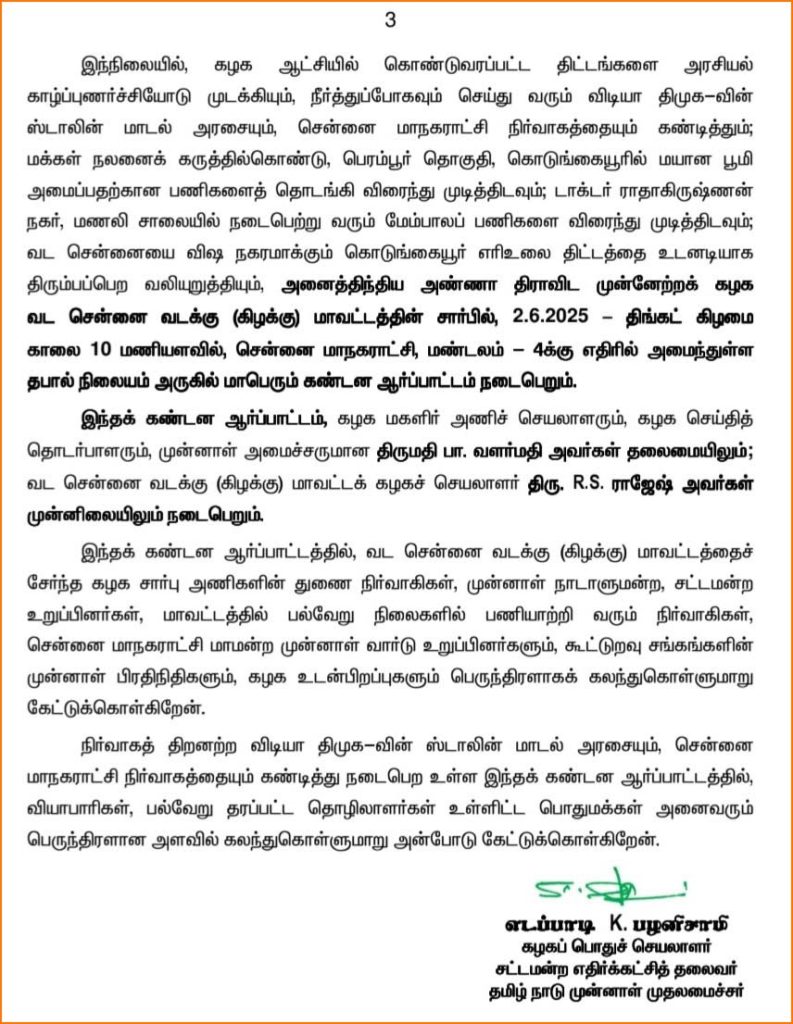 கழக ஆட்சியில் கொண்டுவரப்பட்ட திட்டங்களை அரசியல் காழ்ப்புணர்ச்சியோடு முடக்கியும், நீர்த்துப்போகவும் செய்து வரும் விடியா திமுக-வின் ஸ்டாலின் மாடல் அரசையும், சென்னை மாநகராட்சி நிர்வாகத்தையும் கண்டித்தும்; மக்கள் நலனைக் கருத்தில்கொண்டு, பெரம்பூர் தொகுதி, கொடுங்கையூரில் மயான பூமி அமைப்பதற்கான பணிகளைத் தொடங்கி விரைந்து முடித்திடவும்; டாக்டர் ராதாகிருஷ்ணன் நகர், மணலி சாலையில் நடைபெற்று வரும் மேம்பாலப் பணிகளை விரைந்து முடித்திடவும்; வட சென்னையை விஷ நகரமாக்கும் கொடுங்கையூர் எரிஉலை திட்டத்தை உடனடியாக திரும்பப்பெற வலியுறுத்தியும், வட சென்னை வடக்கு (கிழக்கு) மாவட்டக் கழகத்தின் சார்பில் மாபெரும் கண்டன ஆர்ப்பாட்டம் ஜுன் 2ந்தேதி (2.6.2025 – திங்கட் கிழமை) நடைபெறும் என அறிவிக்கப்பட்டு உள்ளது.
