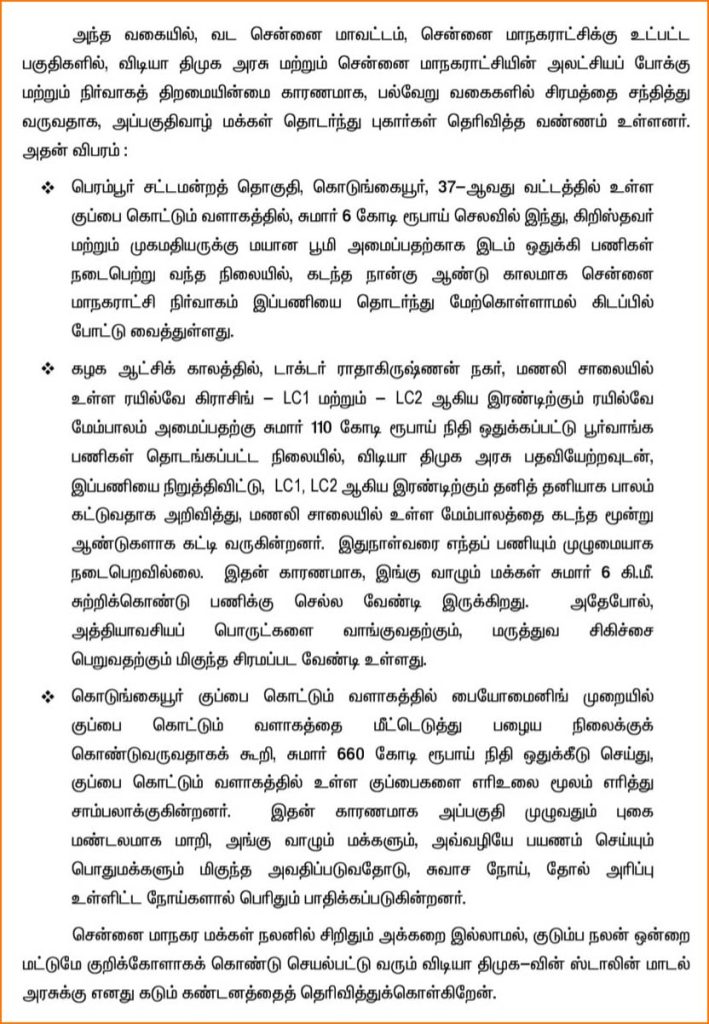 சென்னை மாநகர மக்கள் நலனில் சிறிதும் அக்கறை இல்லாமல், குடும்ப நலன் ஒன்றை மட்டுமே குறிக்கோளாகக் கொண்டு செயல்பட்டு வரும் திமுக-வின் ஸ்டாலின் மாடல் அரசுக்கு எனது கடும் கண்டனத்தைத் தெரிவித்துக்கொள்கிறேன்.