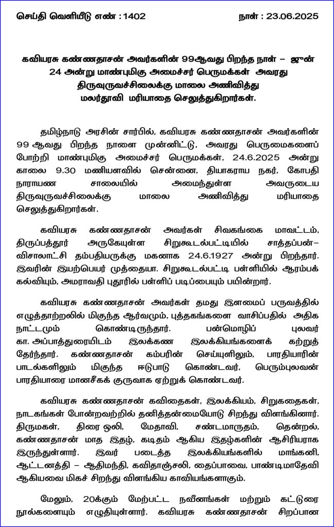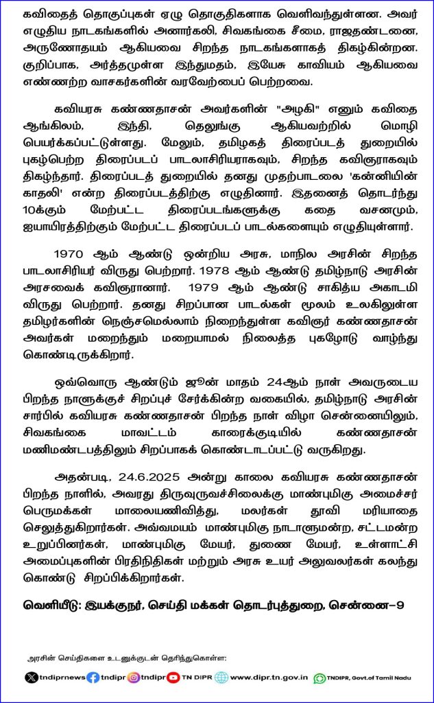 இது குறித்து வெளியிடப்பட்டுள்ள செய்தி குறிப்பில், தமிழ்நாடு அரசின் சார்பில், கவியரசு கண்ணதாசனின் 99 வது பிறந்த நாளை முன்னிட்டு, அவரது பெருமைகளைப் போற்றி அமைச்சர் பெருமக்கள், 24.6.2025 அன்று காலை 9.30 மணியளவில் சென்னை, தியாகராய நகர், கோபதி நாராயண சாலையில் அமைந்துள்ள அவருடைய திருவுருவச்சிலைக்கு மாலை அணிவித்து மரியாதை செலுத்துகிறார்கள்.