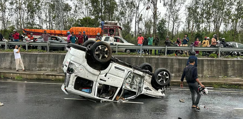 கர்நாடக துணை முதல்வர் டி.கே. சிவகுமார் உடன் சென்ற கான்வாய் தலைகுப்புற கவிழ்ந்ததில் 4 பேர் காயமடைந்தார்.